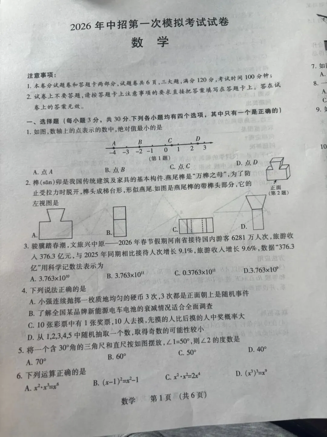 第2题是几何三视图基础题,属于考试中必须拿分的基础题。题目考查立体图形左视图的辨认,难度不大,但仍有不少学生失分。核心原因是部分学生空间想象能力不足,对立体图形的轮廓认知模糊,做题时粗心大意,看错图形细节。