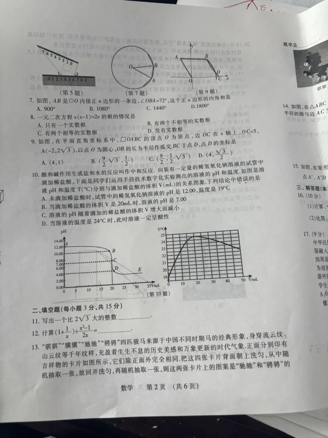 第9题是平行四边形结合坐标计算的几何中档题,是本次考试的主要拉分点之一。题目综合考查平面直角坐标系、平行四边形性质、线段长度计算,解题步骤繁琐,对学生的综合计算能力和图形认知能力要求较高。在讲评时,我逐步骤拆解解题思路,手把手教学生如何从坐标找定点、算边长,强化这类题型的专项练习,规范书写步骤,提升计算准确率。第10题是酸碱中和结合函数图像的跨学科综合题,契合中招新考法趋势。很多学生失分,一是看不懂实际情境对应的图像变化,不会结合题干信息判断图像正误;二对跨学科化学知识的关联能力不足。