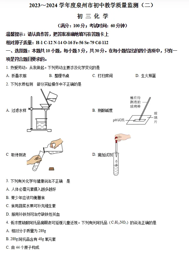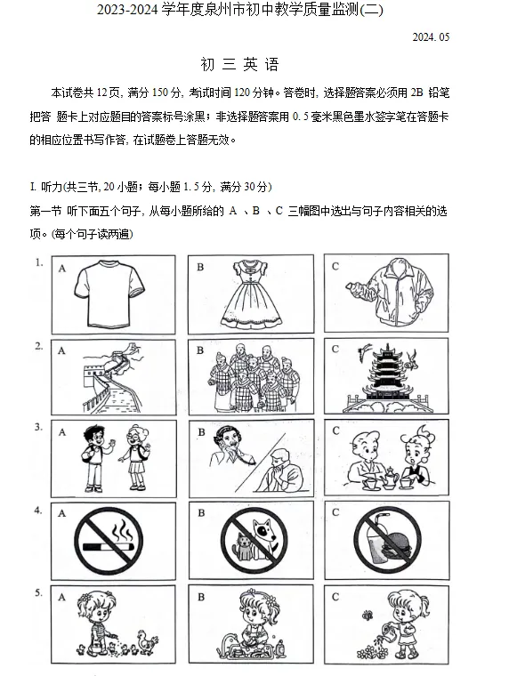 #泉州初三下学期5月质检#泉州中考5月二检真题#泉州市初中毕业班质量监测试卷答案
