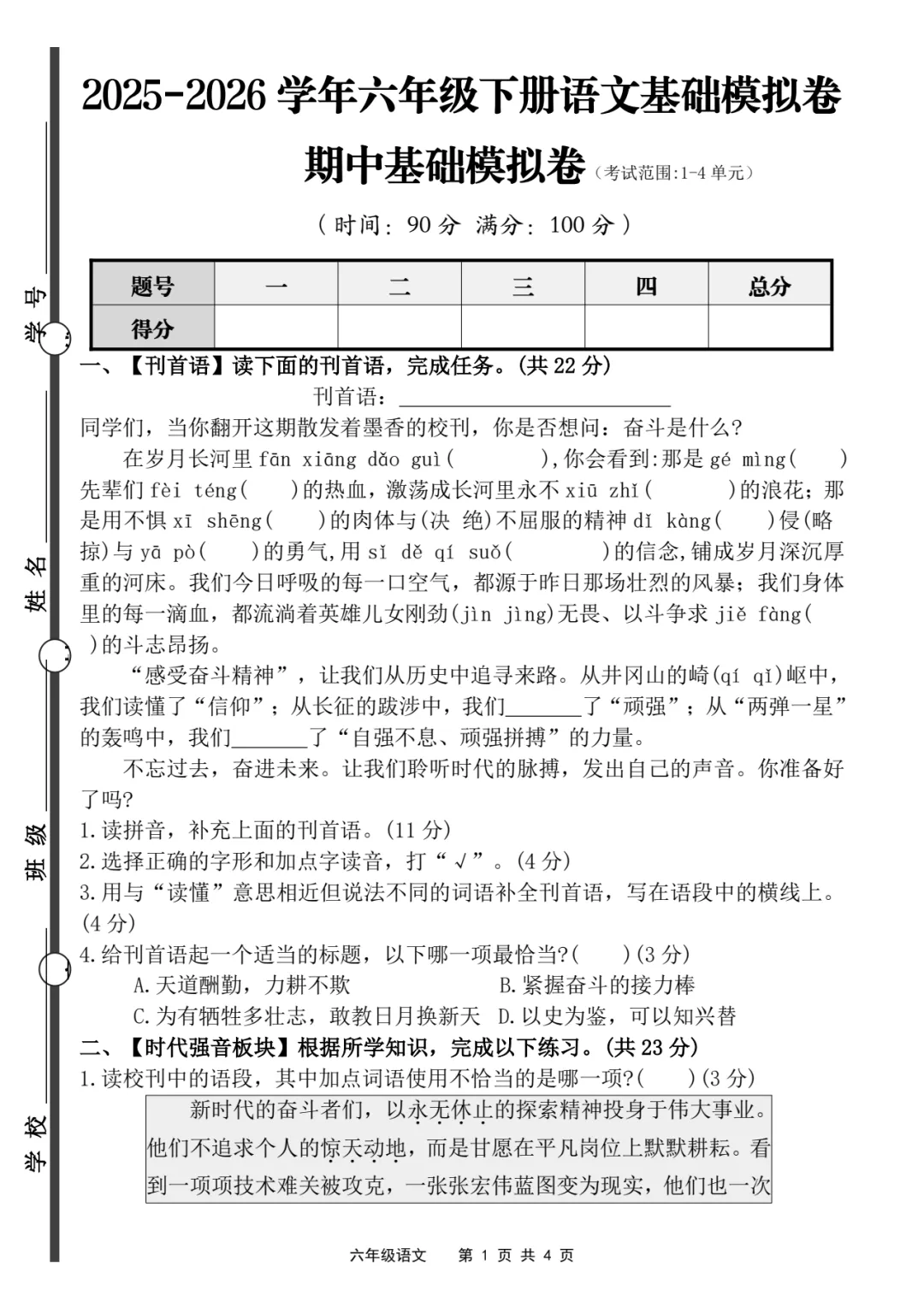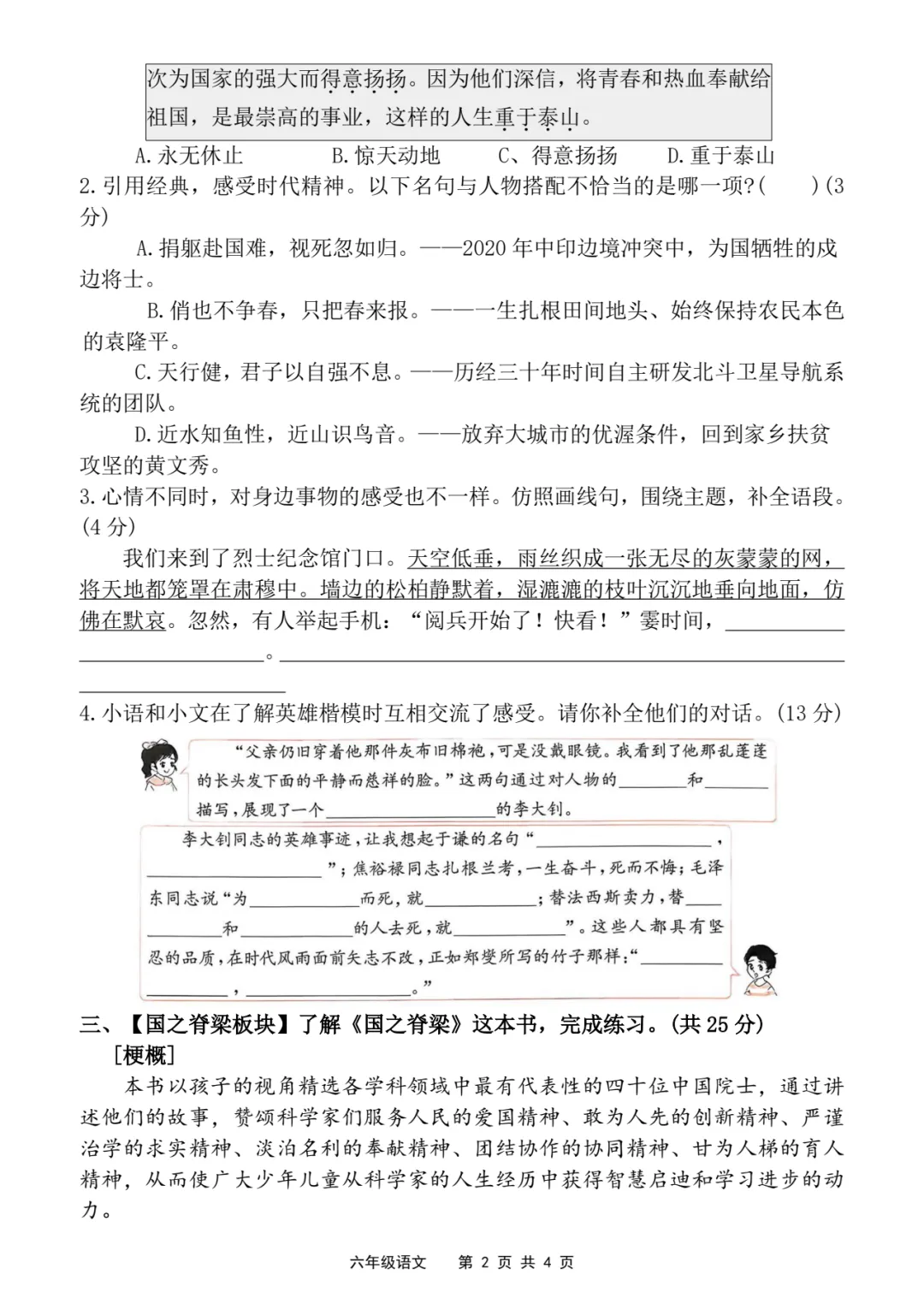 六年级下册语文第一次月考质量检测卷(一、二单元)