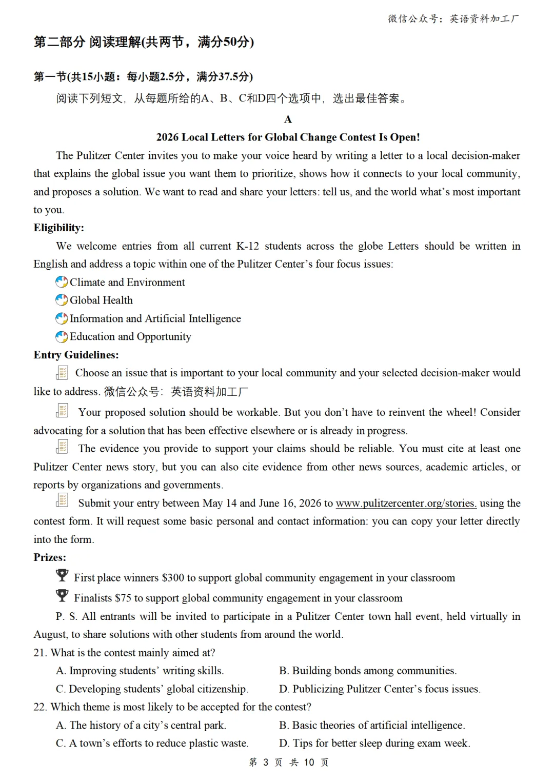 【阅读CD】免费下载!26年3月各地高三联考/模拟考英语阅读C篇、D篇各32篇合集,含答案解析