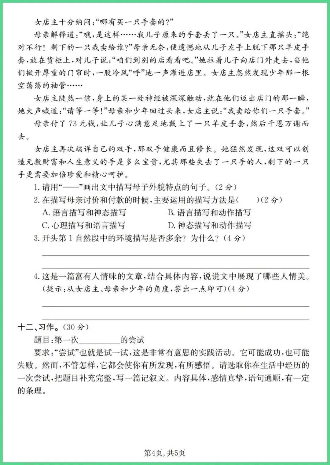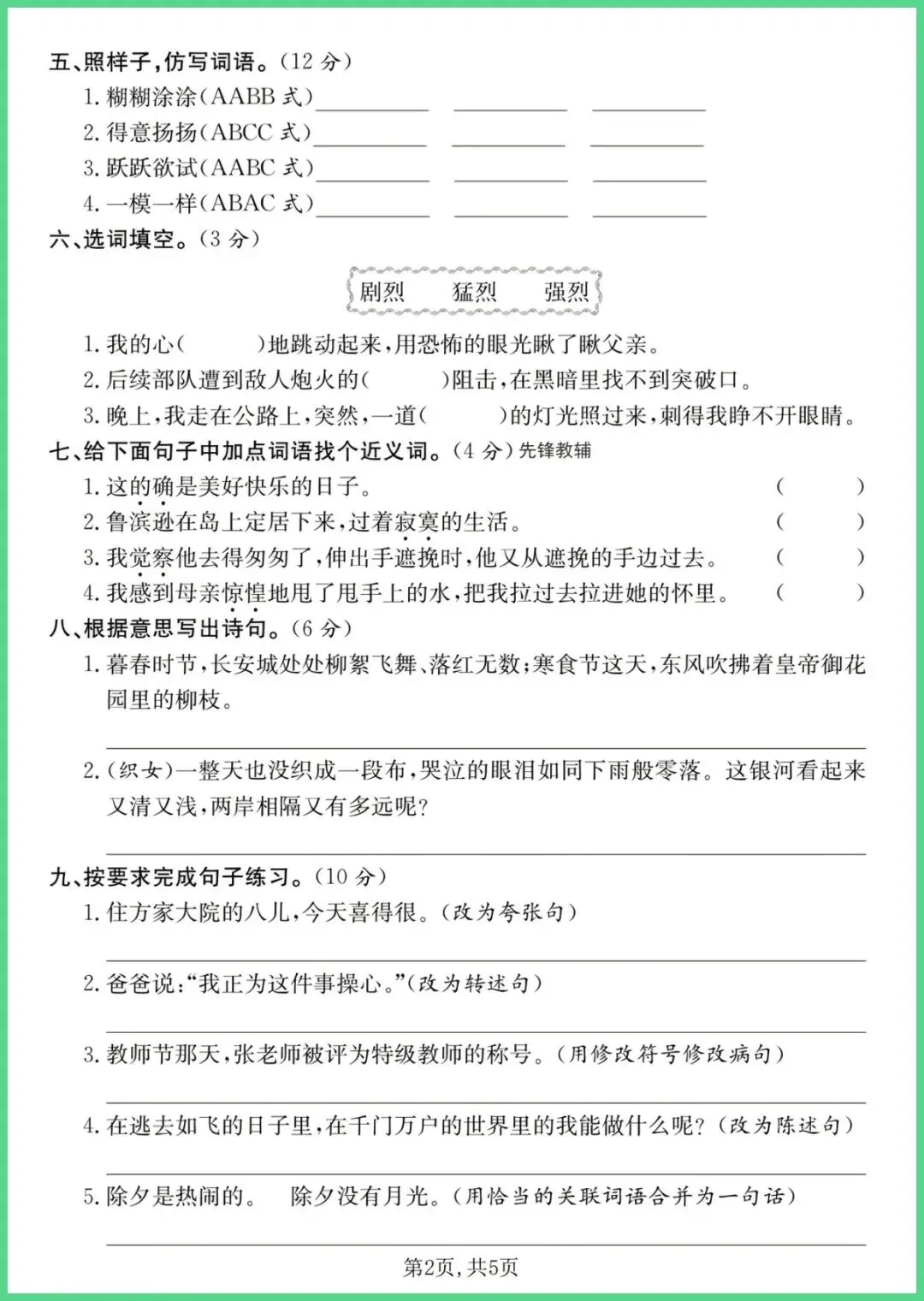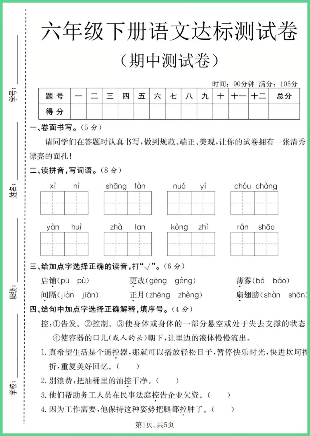 2026春人教版六年级下册语文期中达标测试卷新鲜出炉!5页精编,紧扣新课标,电子版一键打印。涵盖基础巩固、阅读拔尖、习作演练三大模块,题型与真题同源,附详细答案与评分标准。让孩子30分钟速测薄弱点,4步拆解高分答题套路,轻松锁定班级前十!想期中逆袭的家长,现在就把卷子打印出来,今晚就练!