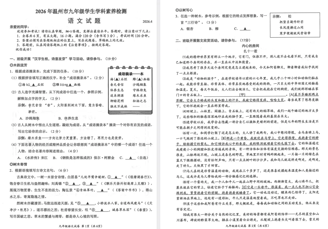 >【语文一模】2026年温州语文一模试卷(含答案)