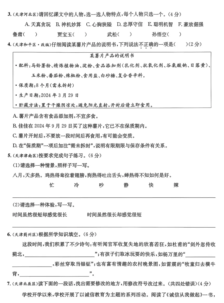 “26春小学天津真题圈五年级语文下
