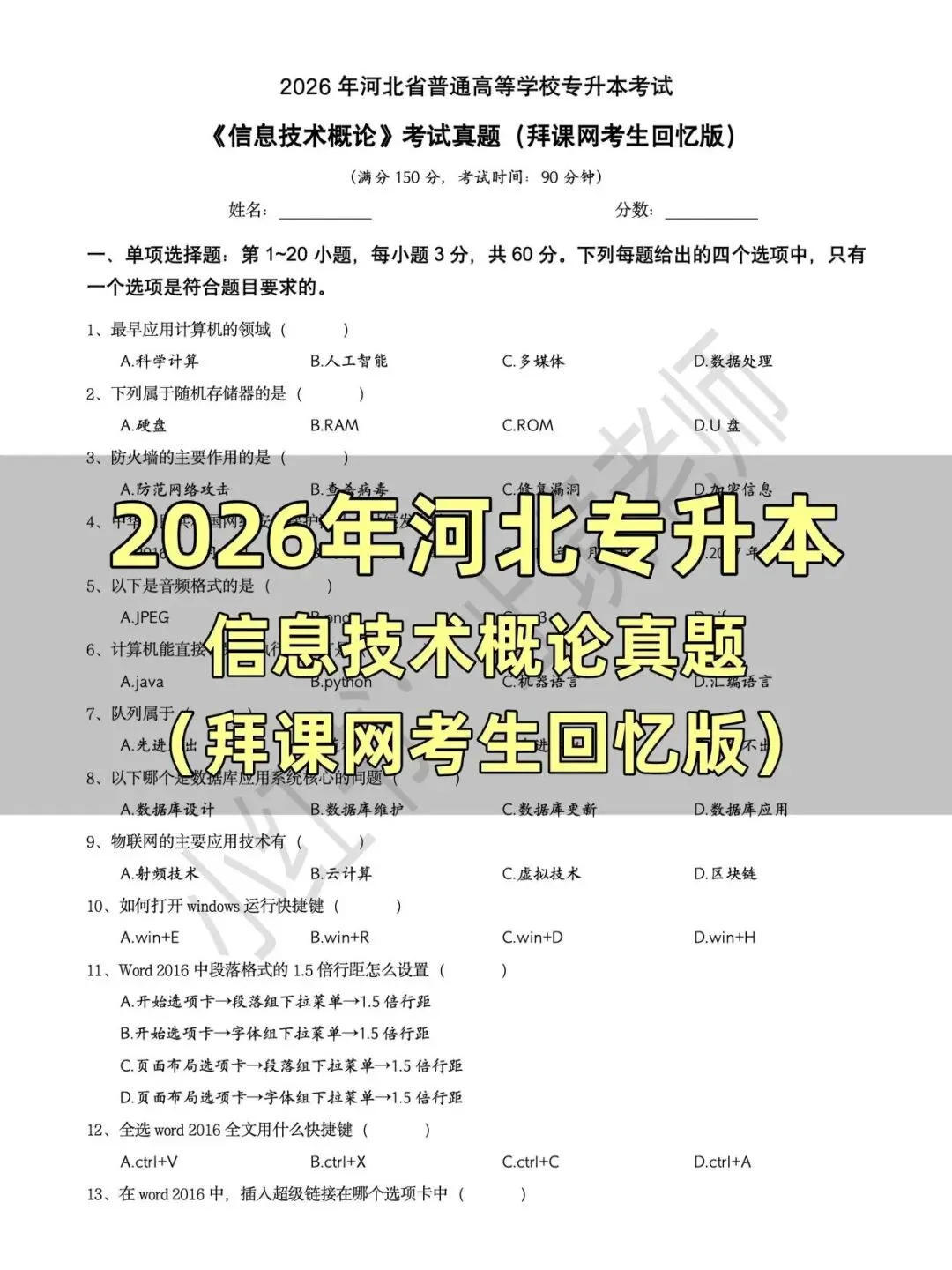 >2026河北省专升本信息技术概论考试真题(考生回忆版)