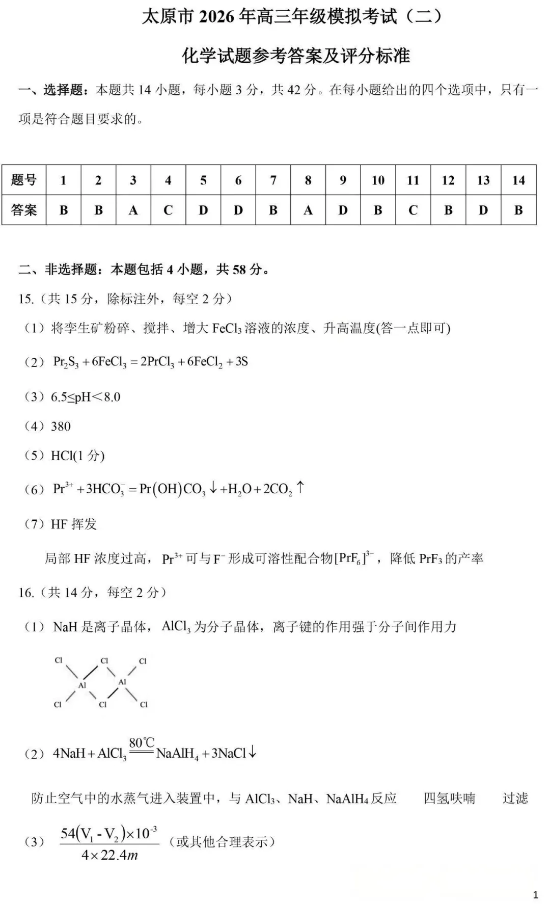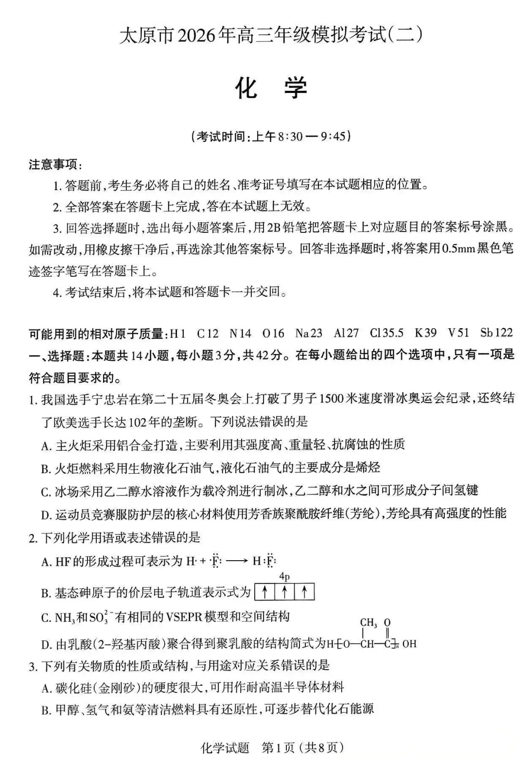 就在最近2026太原高三二模刚刚结束。本次就为大家准备了2026太原高三二模化学试卷,以及配套的答案。供大家下载学习。