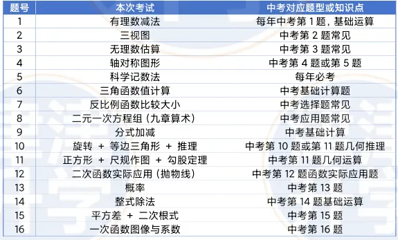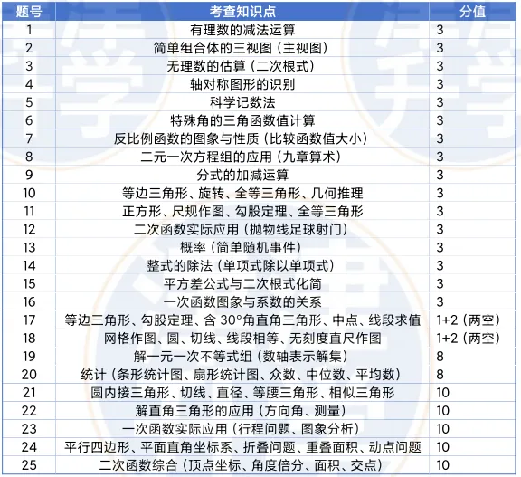 基础题占比约37.5%,覆盖有理数、视图、估算、轴对称、科学记数法、三角函数、反比例函数、方程组、分式、概率、整式运算、平方差、一次函数性质等,适合学生夯实基础。