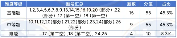 难题占比约25%,集中在第24题折叠动点与重叠面积取值范围、第25题二次函数中角度关系与面积综合,体现压轴题选拔功能。