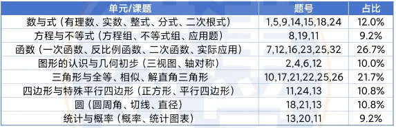 知识单元中,函数(一次、反比例、二次)占比最高(26.7%),其次是三角形与解直角三角形(21.7%)、四边形(10.8%)、圆(10.8%),数与式、方程、统计概率均衡分布。