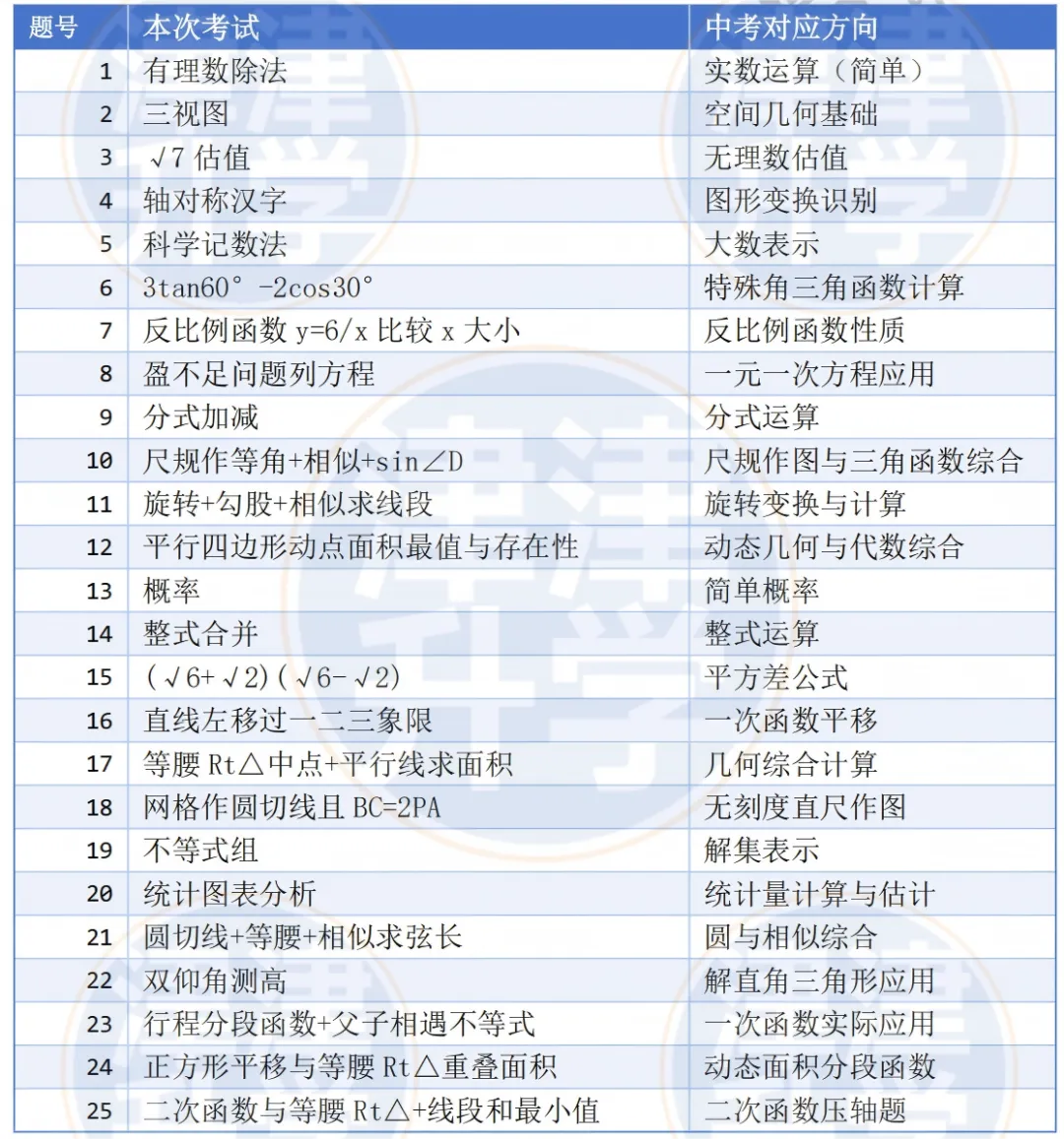 中考数学题目通常考查类似知识点,但更注重综合应用。以下对比本次考试题目与中考常见题型: