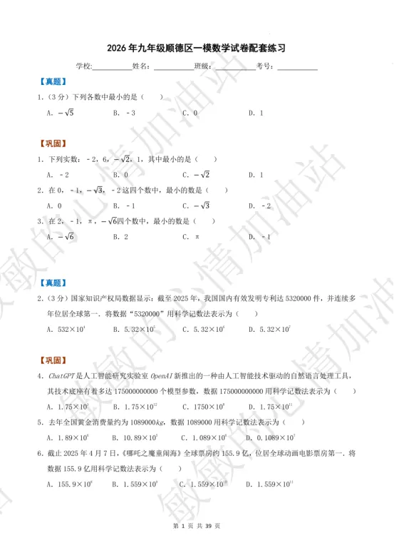 基于此,我特地出了一套《2026年九年级顺德区一模数学试卷配套练习》,针对每一道真题,都配了1-3到类似的习题,帮助考完试的同学查漏补缺,后面还有参考答案,足足39页。