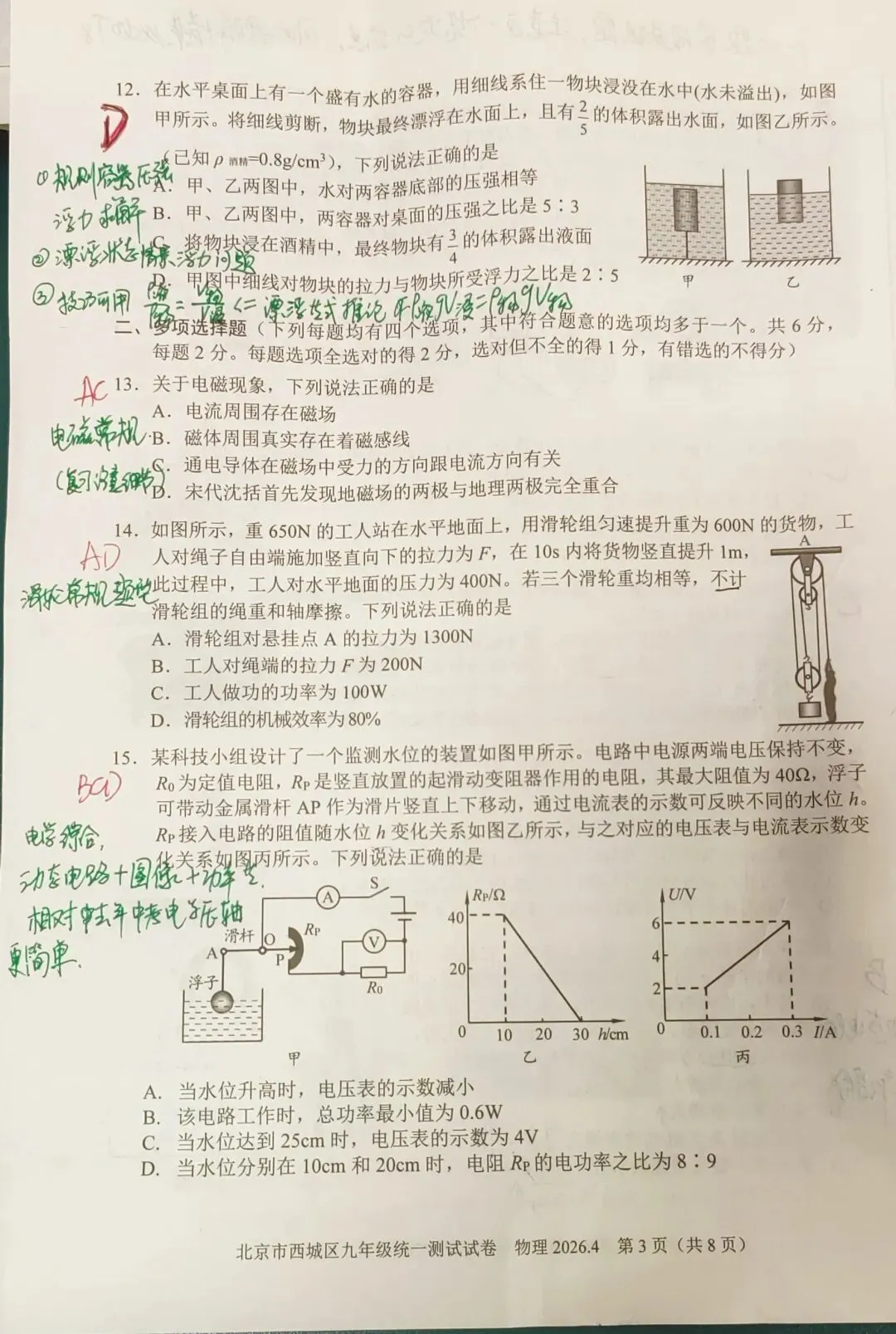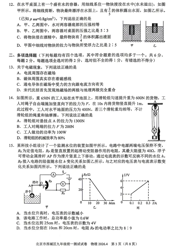 12题考察规则容器的压强和浮力求解、漂浮状态与绳拉物的情景,难度适当。
