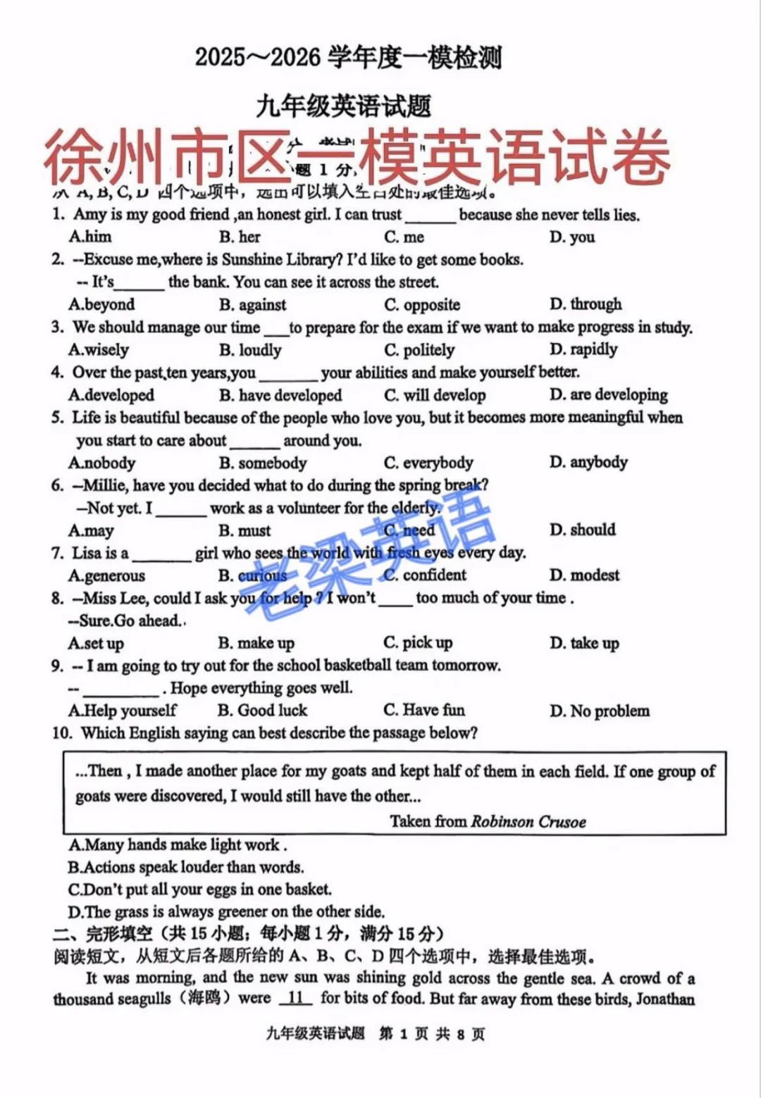 >徐州市区2026中考一模英语试卷