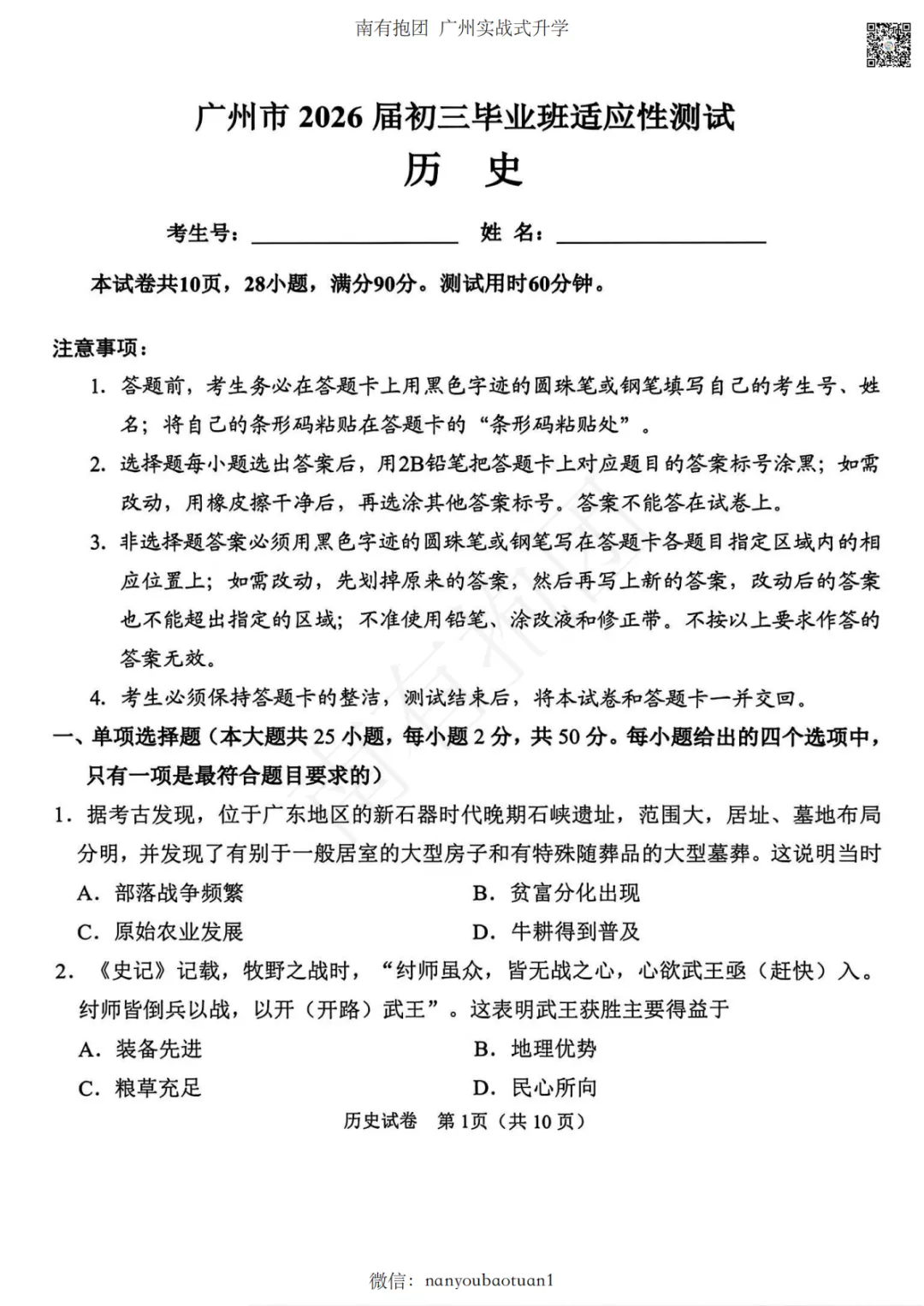 这次适应性测试历史试题不难,常规试卷,整体难度适中,与广州中考保持了高度的对标准确性。