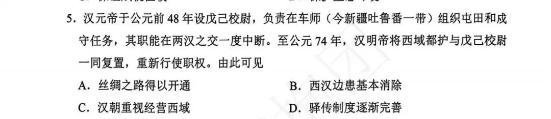 重视时序梳理: 比如第5题跨越西汉到东汉的西域经营,要求你在长时段中把握延续与变迁。建议用时间轴自己动手梳理中国古代史、近现代史的关键节点,做到“提到年代就能定位朝代,提到朝代就能说出阶段特征”。