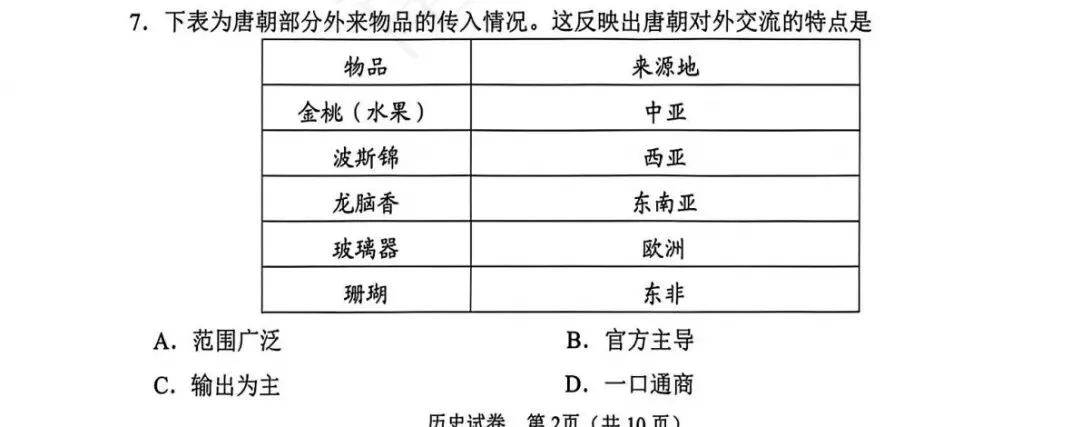 强化主题整合: 第7题唐朝外来物品、第23题苏俄经济政策调整,都是围绕某一主题(如中外交流、经济政策)的考查。备考时尝试把分散在各课的同类史实归拢,形成“专题线索”。