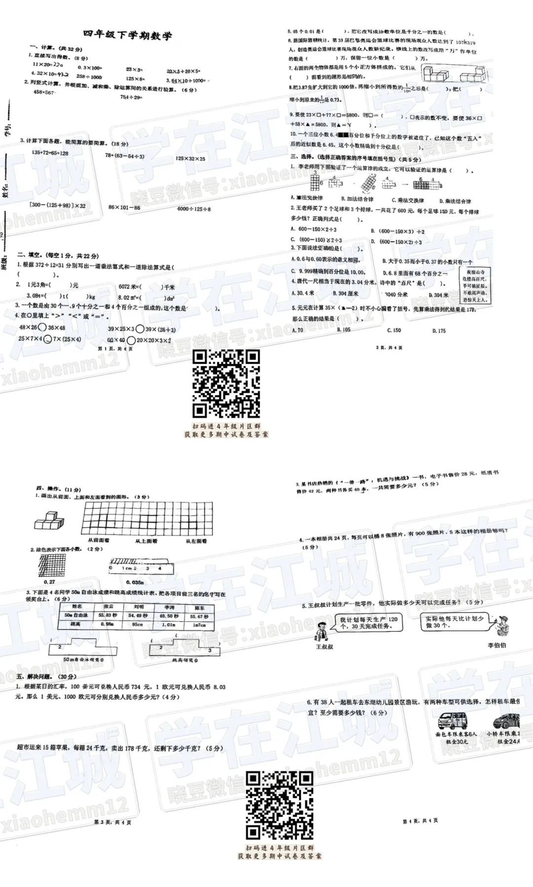 【4年级江岸区长春街三小数学试卷】2024-2025下学期期中