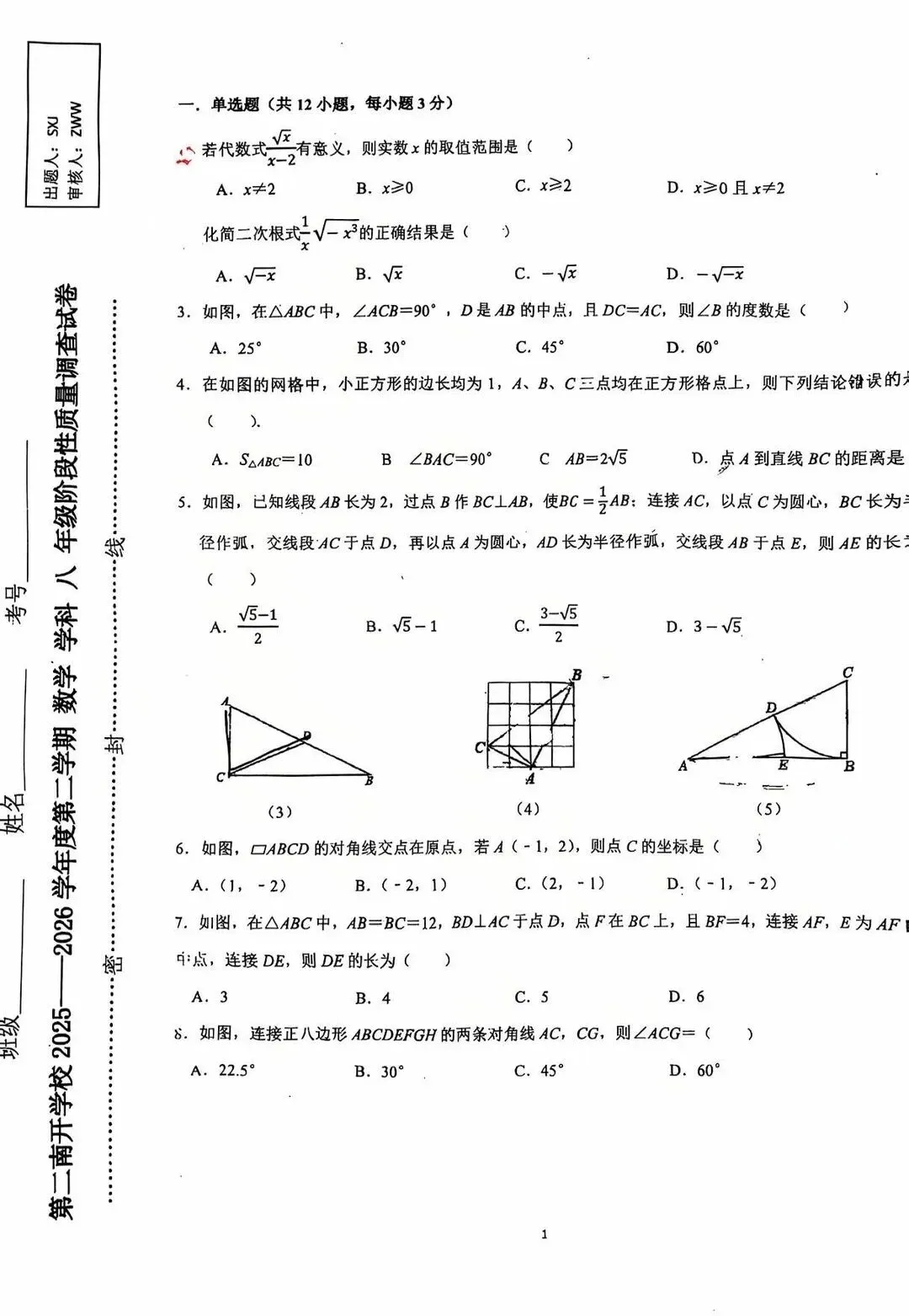 2026天津市和平区二南开八下期中数学试卷