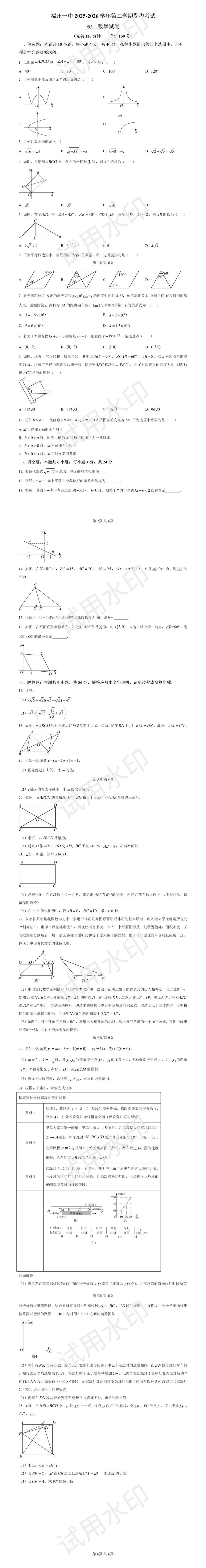 【初二数学】福州一中26年半期考数学试卷