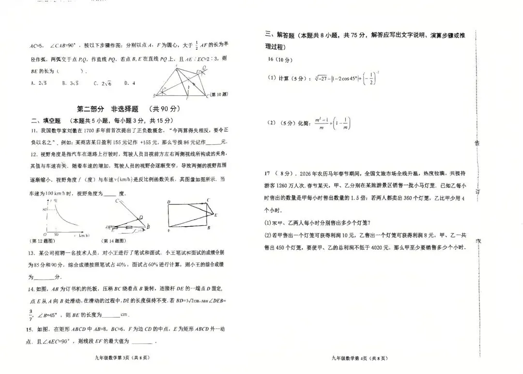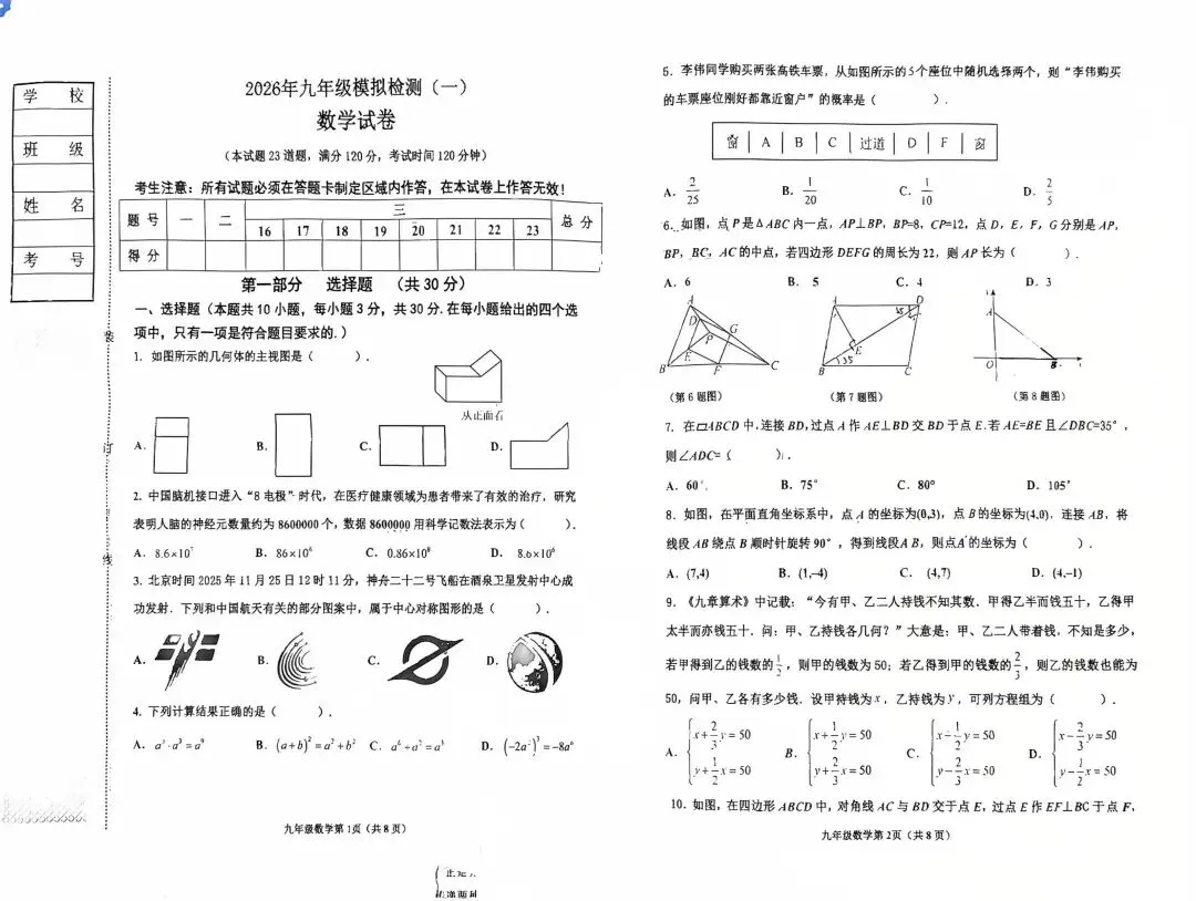 本次九年级数学模拟试卷整体结构规范,贴合中考命题导向,满分120分,涵盖选择、填空、解答三大题型,全面考查初中数学核心知识与关键能力。选择题部分侧重基础概念辨析,如科学记数法、中心对称图形、三视图等,多数题目难度适中,但第5题的概率计算、第10题的几何综合对学生的审题与建模能力提出了一定要求。填空题聚焦基础运算与几何性质,如反比例函数应用、矩形性质等,整体难度梯度合理。解答题分层设计,从基础计算、分式化简,到方程应用、函数综合,再到几何证明与压轴题,层层递进,有效区分不同层次学生的能力水平。试卷注重考查学生的数学运算、逻辑推理、几何直观与应用意识,尤其是函数与几何综合题,突出了数形结合思想的应用,对学生的综合解题能力提出了较高要求。