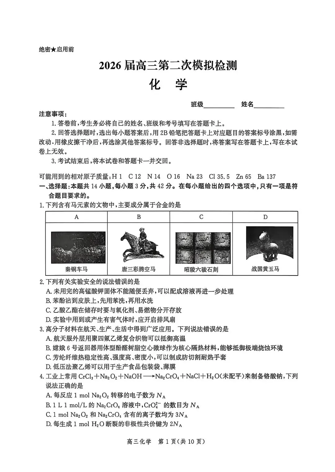 河北邯郸2026高三二模化学试卷及答案