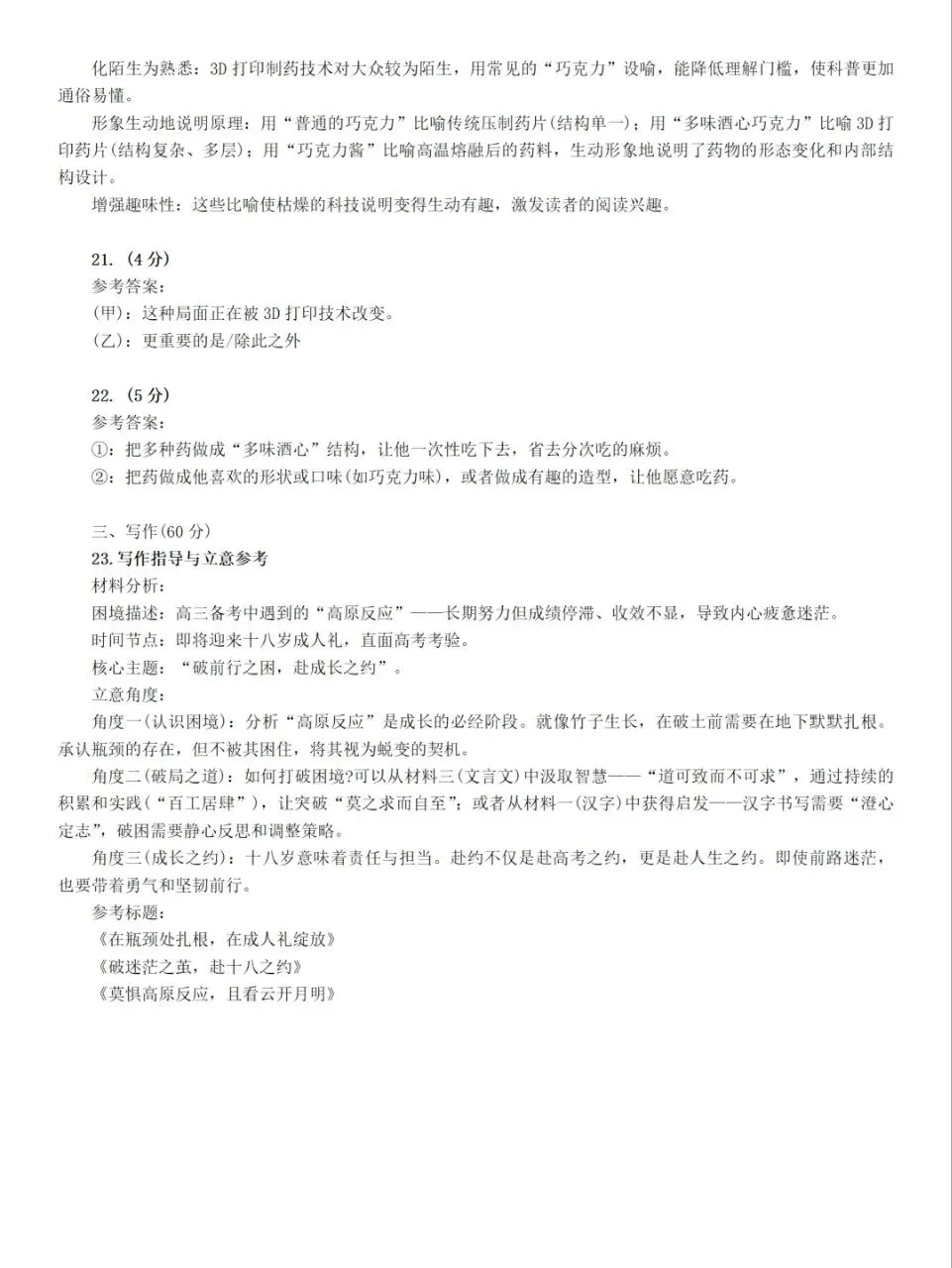 20.文中介绍MED赋能 3D打印制药时,多次以“巧克力”设喻,如“普通的巧克力”“多味酒心巧克力”“巧克力酱”等,请简要分析其合理性。(4分)