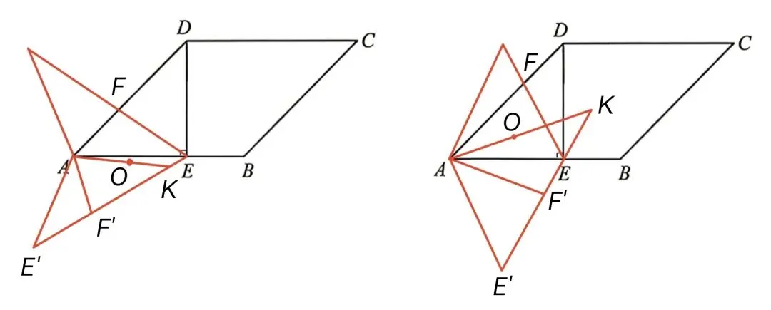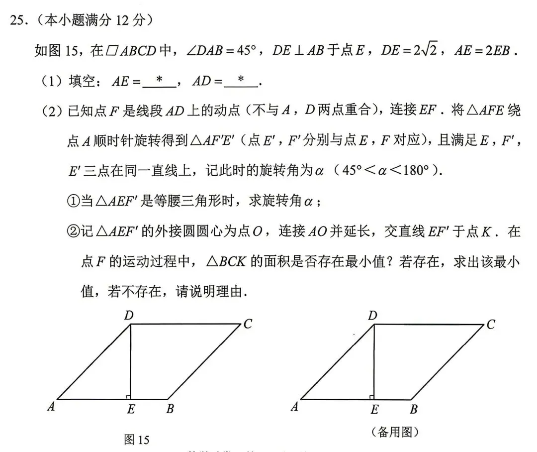 虽然很多公众号把这道题归类为隐圆的套路题,但这只是最后的一问的最后步骤。绝大部分同学真正碰到的困难是怎么画出符合题目要求的图形,到底有几种可能的情况,能否准确画出每种情况的示意图。其实并不是随便在AD上取一个点F就能画出符合要求的图形,为了满足旋转角的要求,点F的位置其实有隐形的限制(需要AF≤AE)。准确的画出外接圆圆心点O对于画出点K的位置非常关键,但大多数同学对于外接圆圆心位于锐角三角形内,而位于钝角三角形外这一点并不熟悉,很难准确画出两种不同情况的示意图。这道题的命题应该参考了2023年广州中考压轴题(下图),也是一道等腰三角形分类情况作为中档区分过渡,然后以面积最值为压轴,背后仍然是定角定边的隐圆模型。但很明显,2026年这次一模比2023年中考更强调学生现场理解题意,现场分析作图的实际应用能力,同时对分类讨论的思维严谨性要求更高。