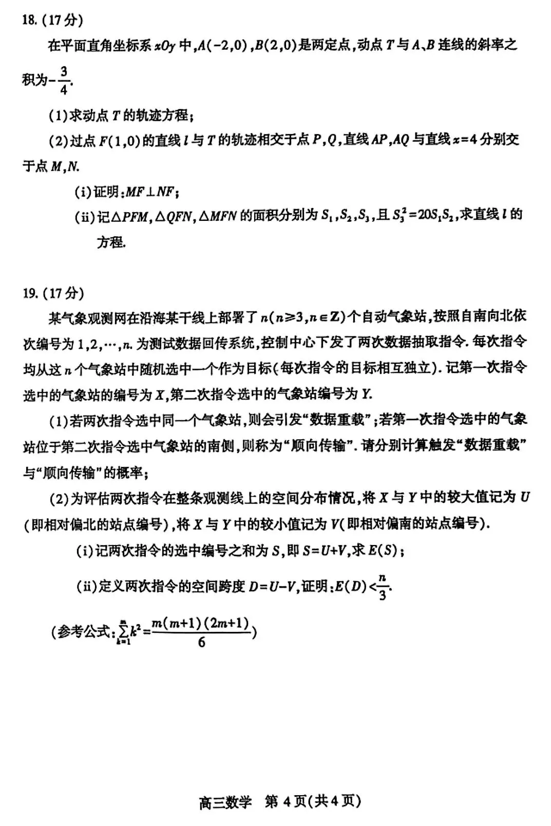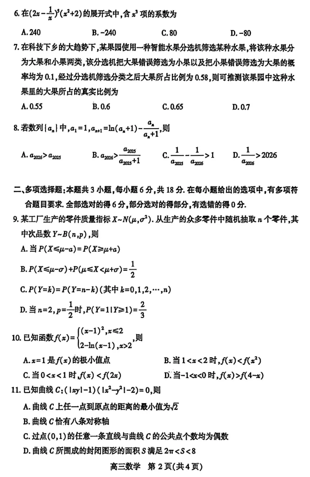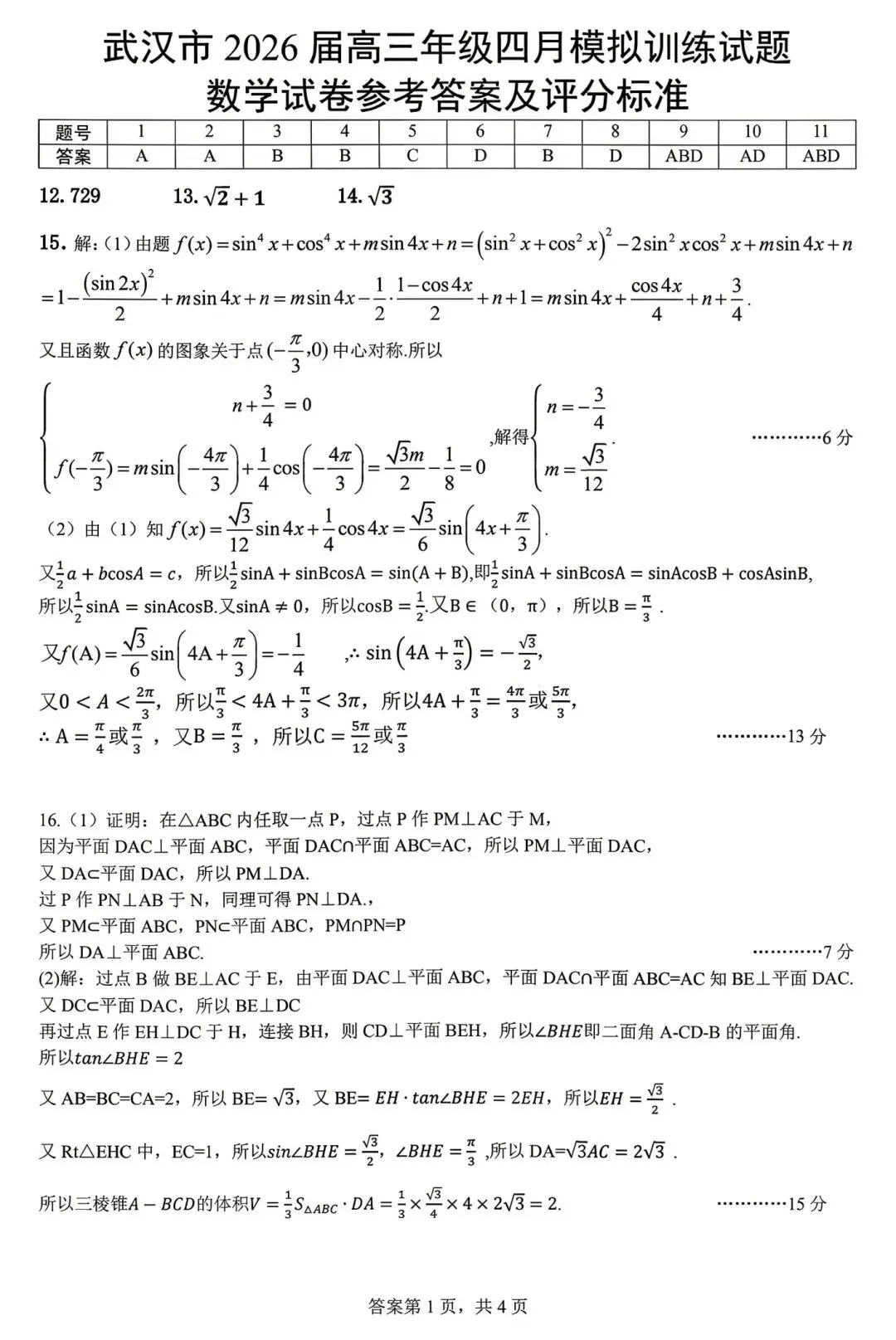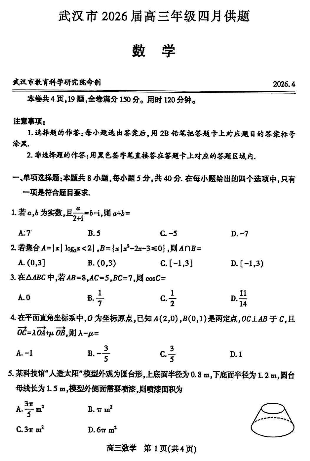 2026届高三4月武汉四调数学试卷及答案