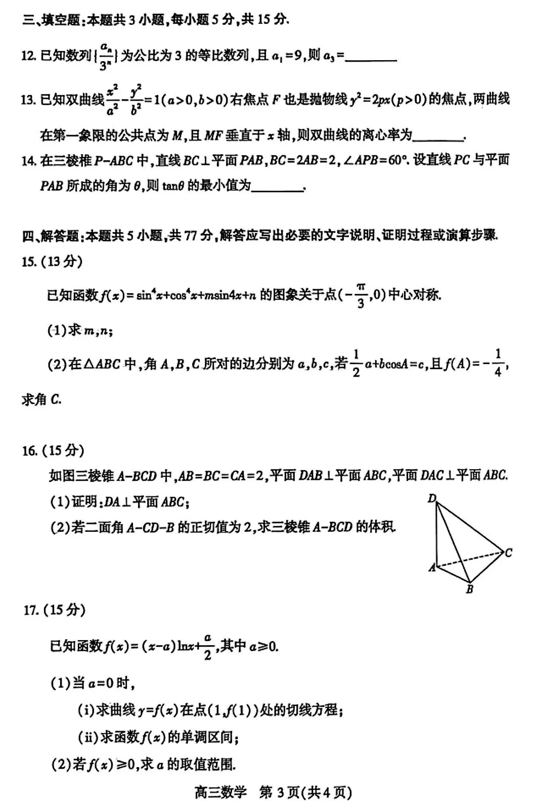 >2026届高三4月武汉四调数学试卷及答案