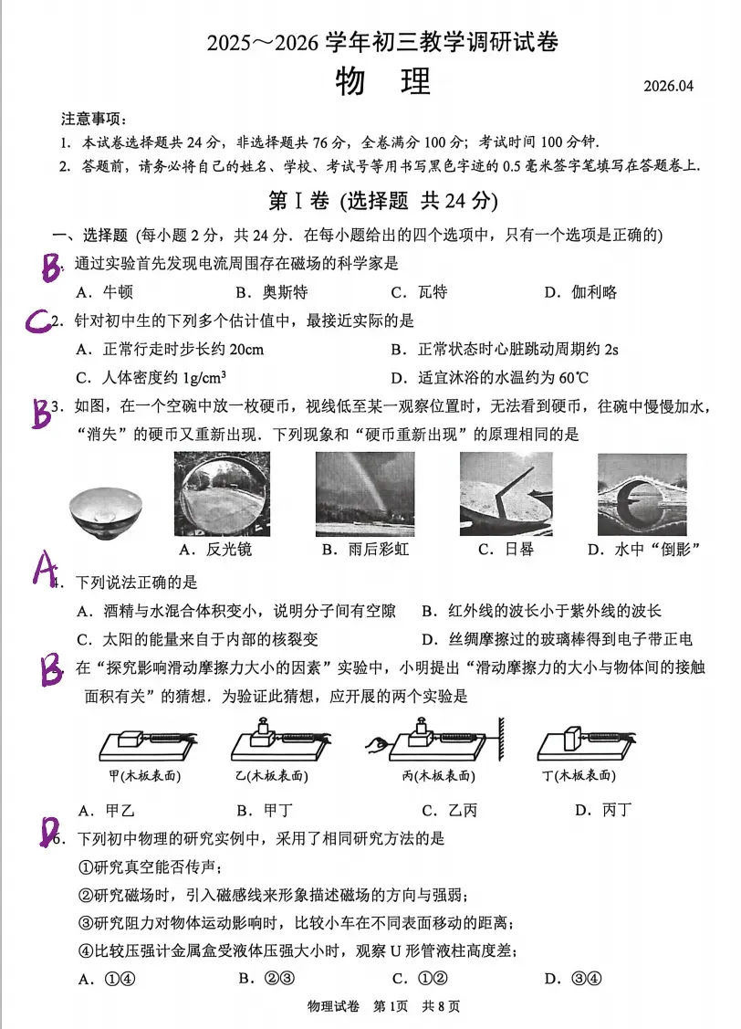 2026苏州园区中考一模物理试卷+参考答案(2026.4.27)