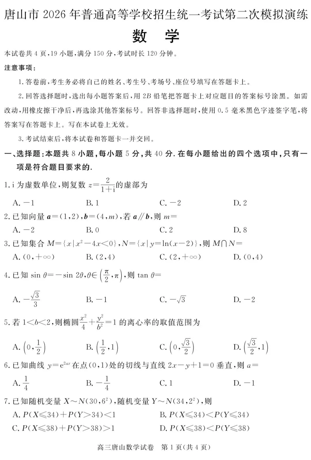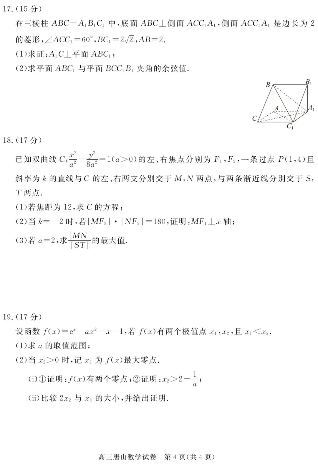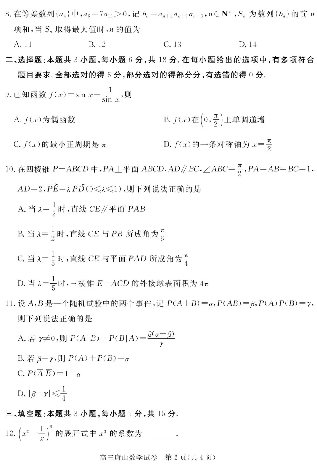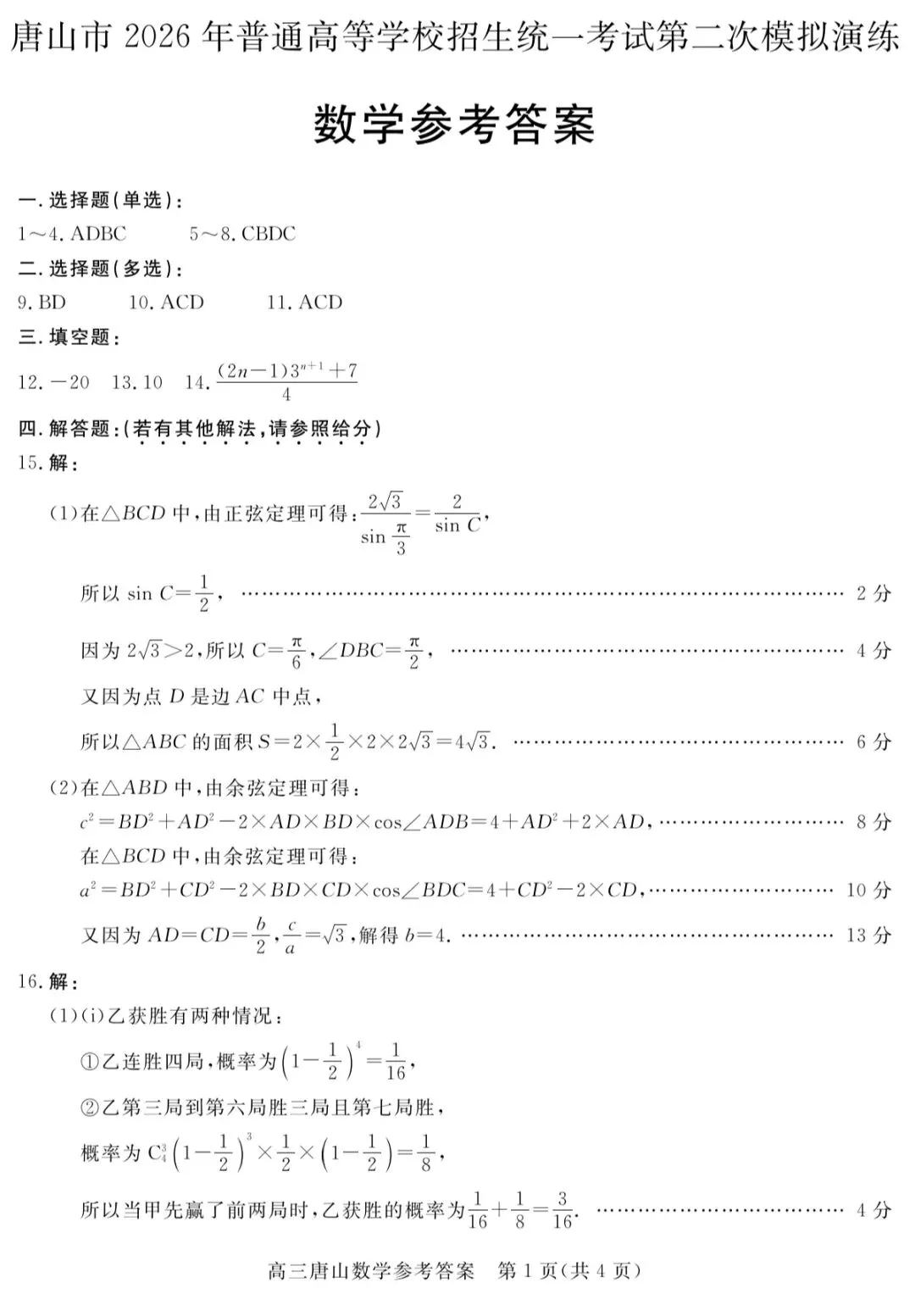 2026年4月河北唐山二模数学试卷答案及选填压轴题解析