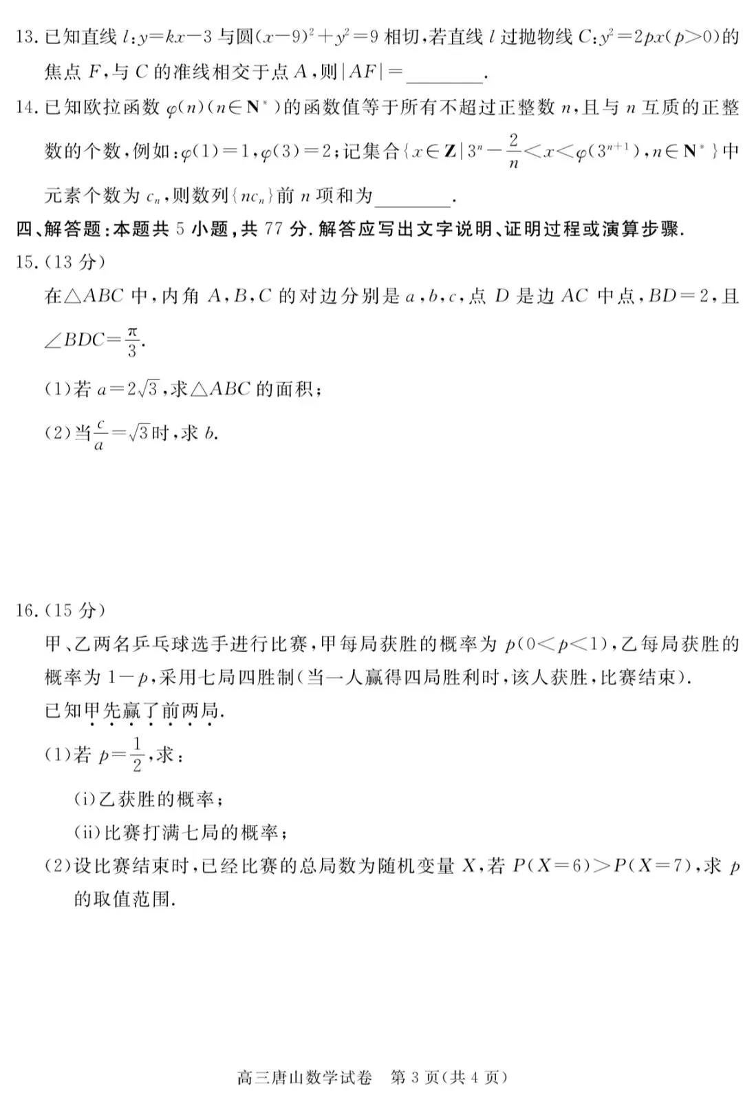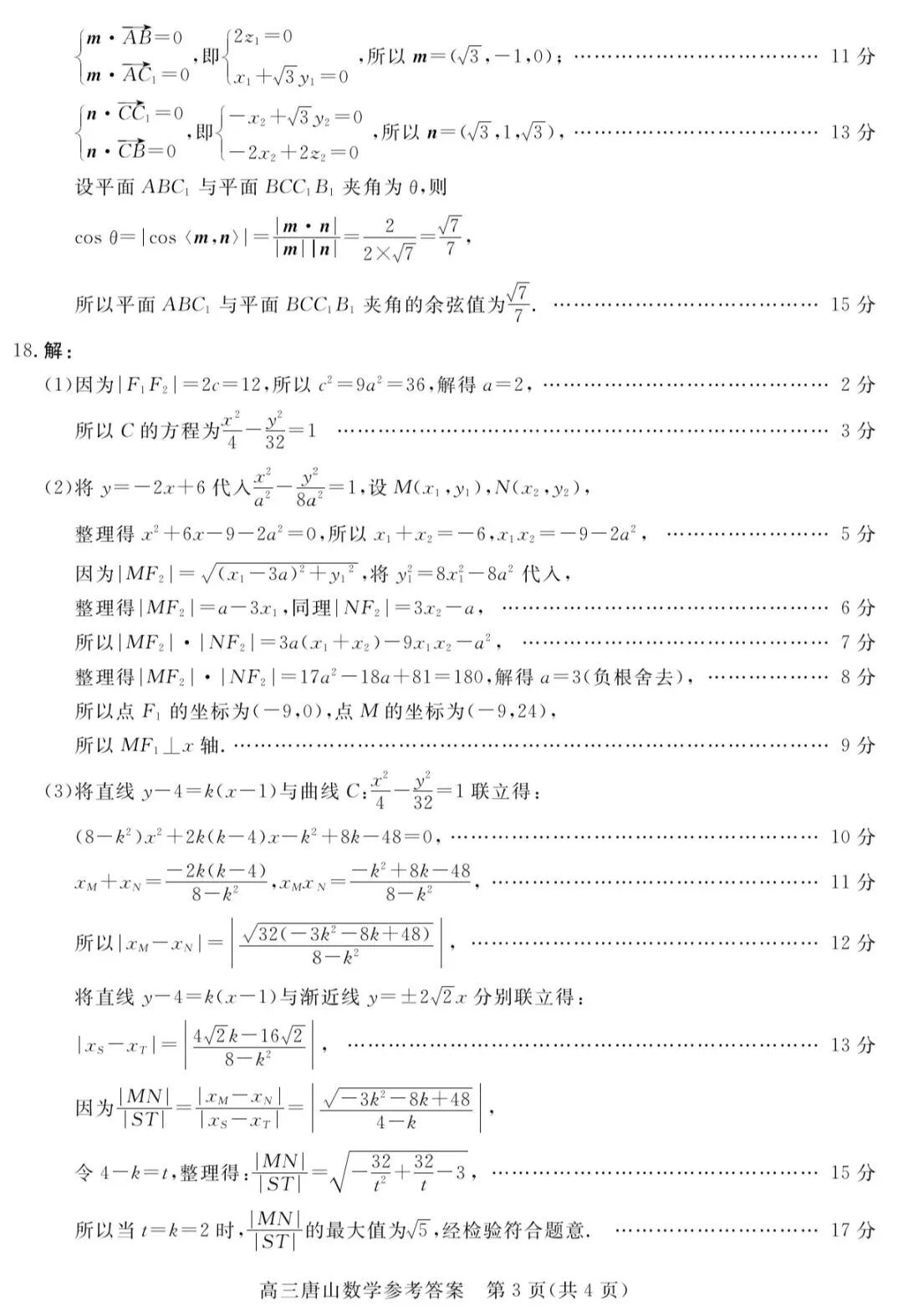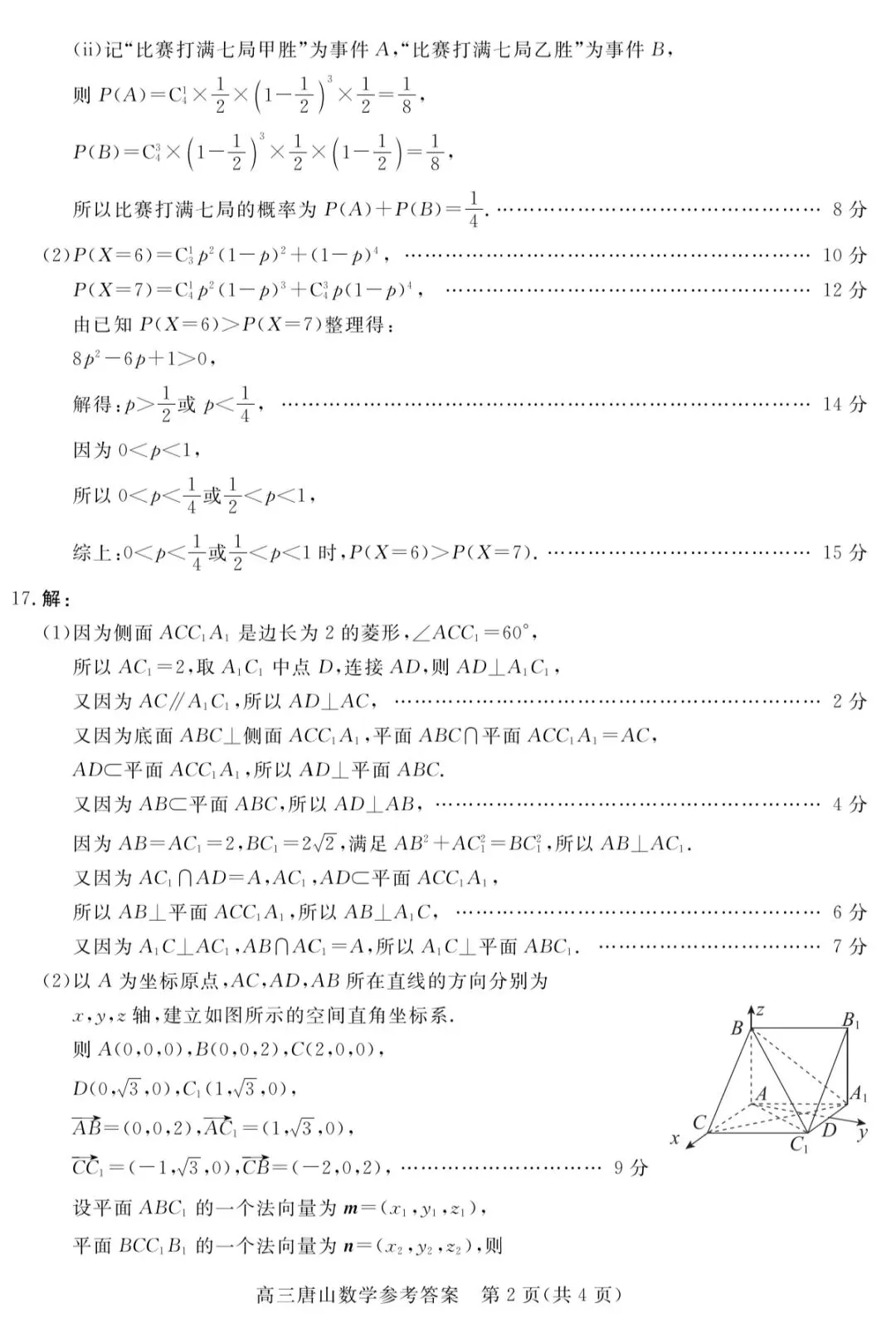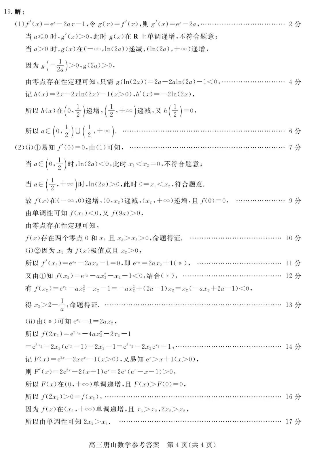 2026年4月河北唐山二模数学试卷答案及选填压轴题解析