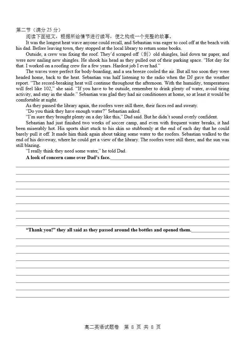 11-15分情节大致完整,但有跳跃或不合理之处;缺乏情感变化或成长点语言基本达意,但有明显语法/用词错误;句式单调,偏流水账;忽略前文某些细节(如热浪、工人状态、有水补给后的反应)