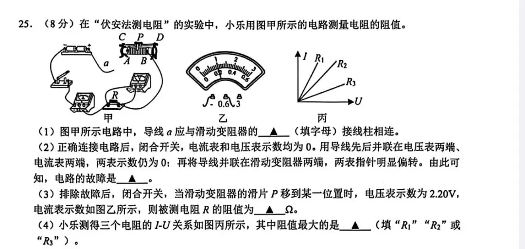 核心重点二:伏安法实验与电路故障伏安法测电阻、测电功率是杭州中考必考内容,这次一模也重点考查。除了基本操作,更侧重电路故障分析、电表读数、I-U图像识别,以及滑动变阻器的作用与选择。很多学生能连电路,但一遇到故障判断就容易混乱。