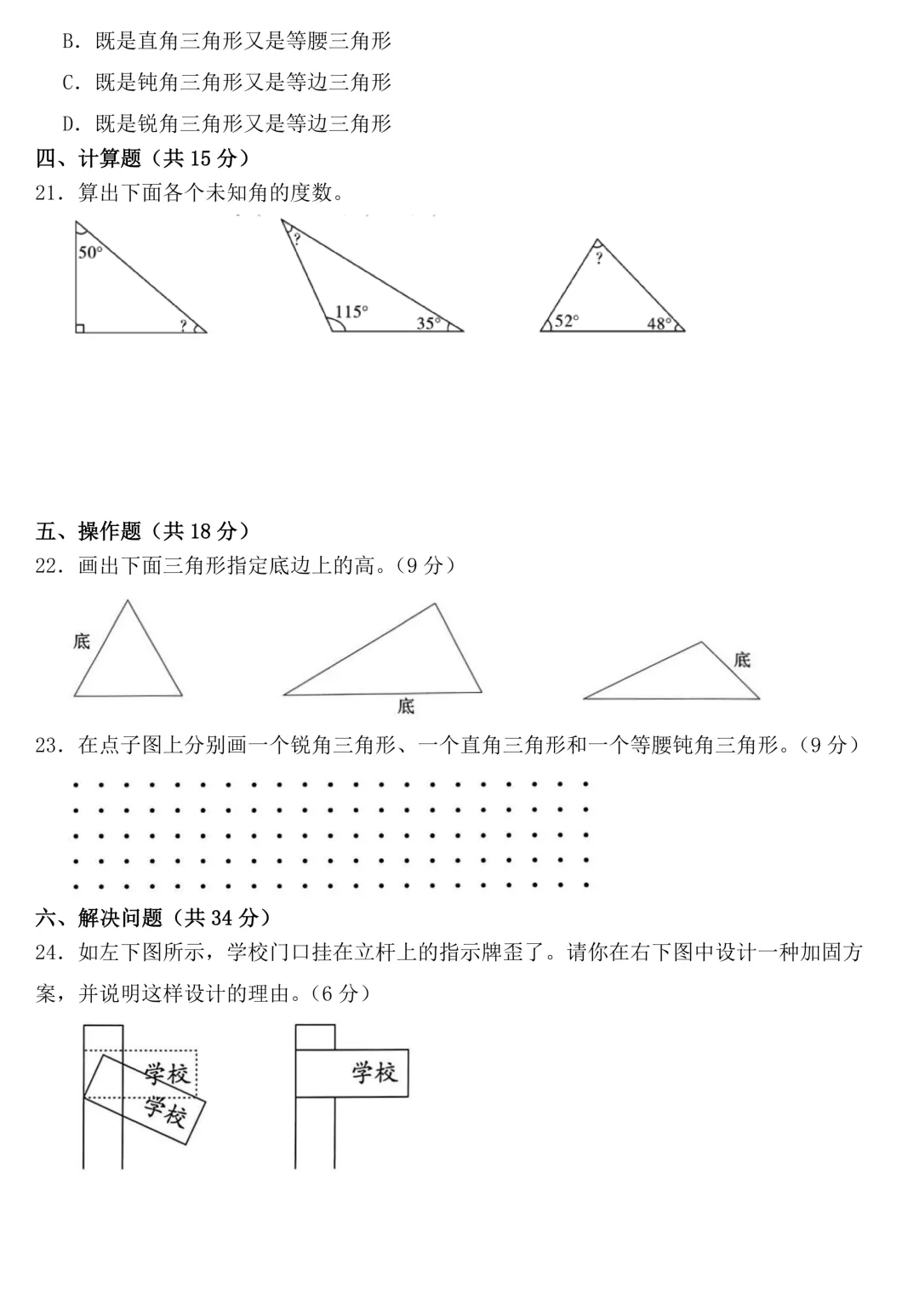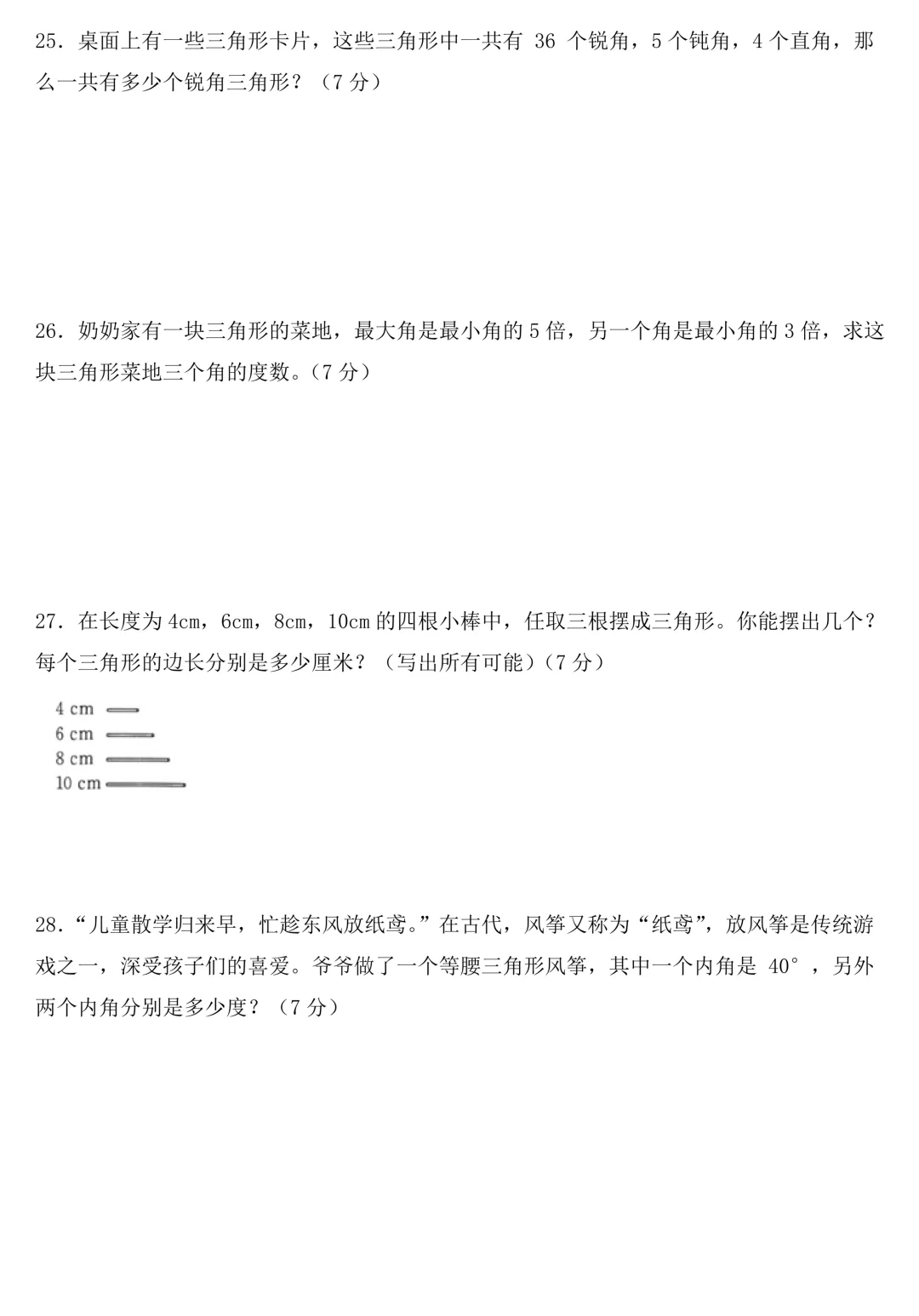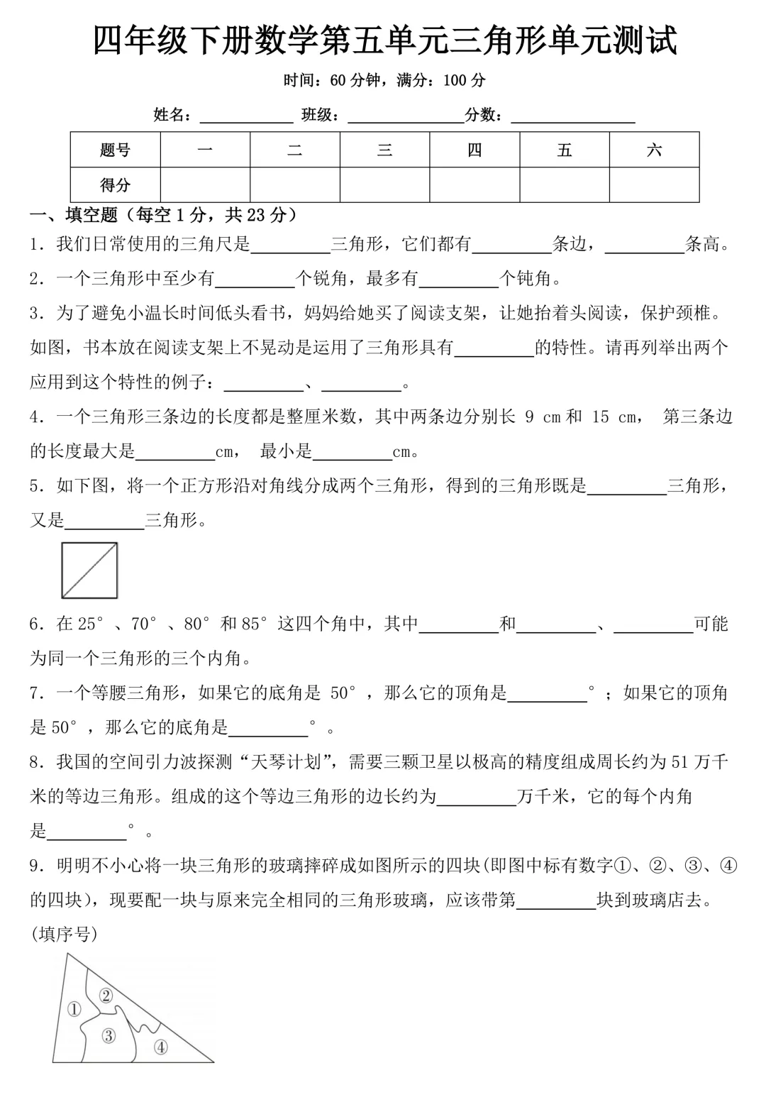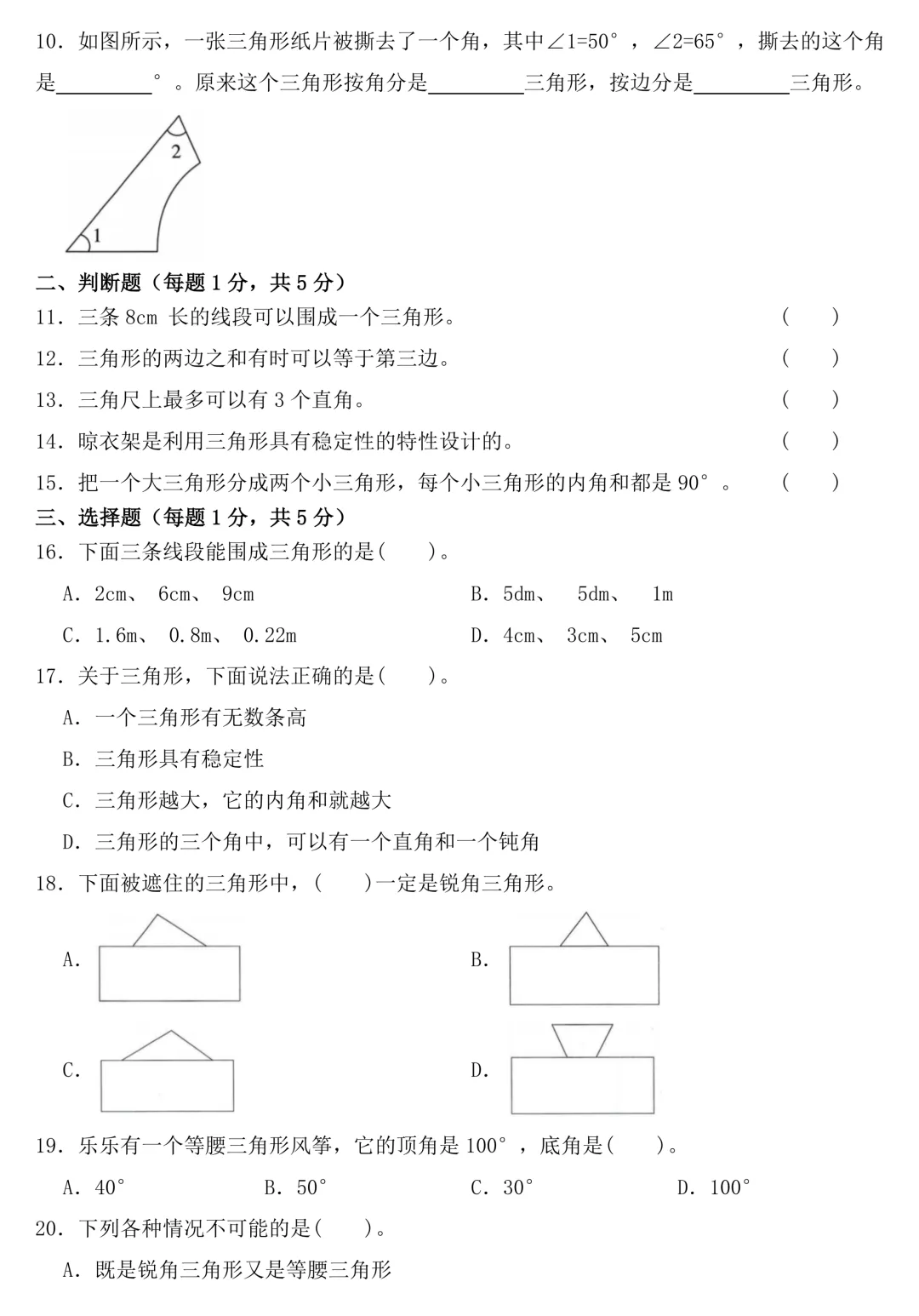 四年级下册数学 第五单元《三角形》测试试卷,涵盖历年常考必考的高频考题,赶紧码