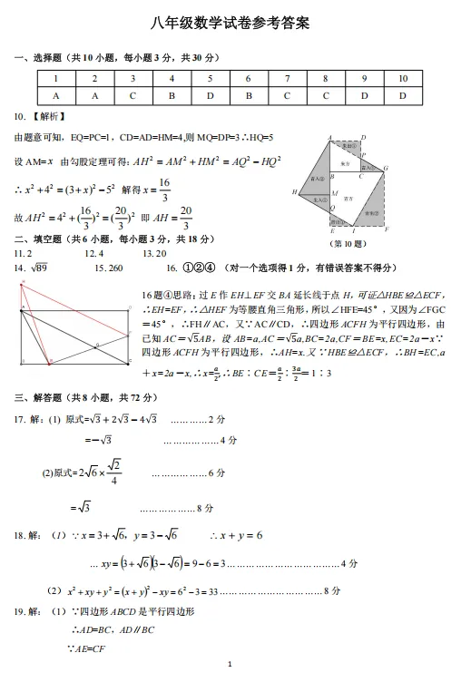 >2026武汉市洪山区八下数学期中试卷及评分标准