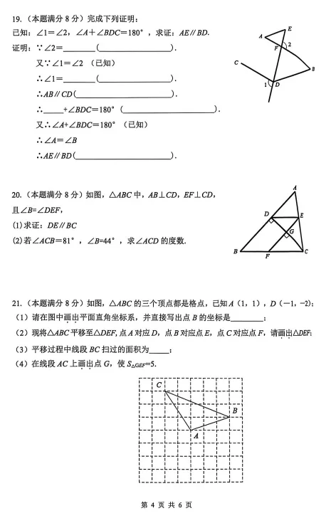 2026武汉市洪山区七下数学期中试卷及评分标准