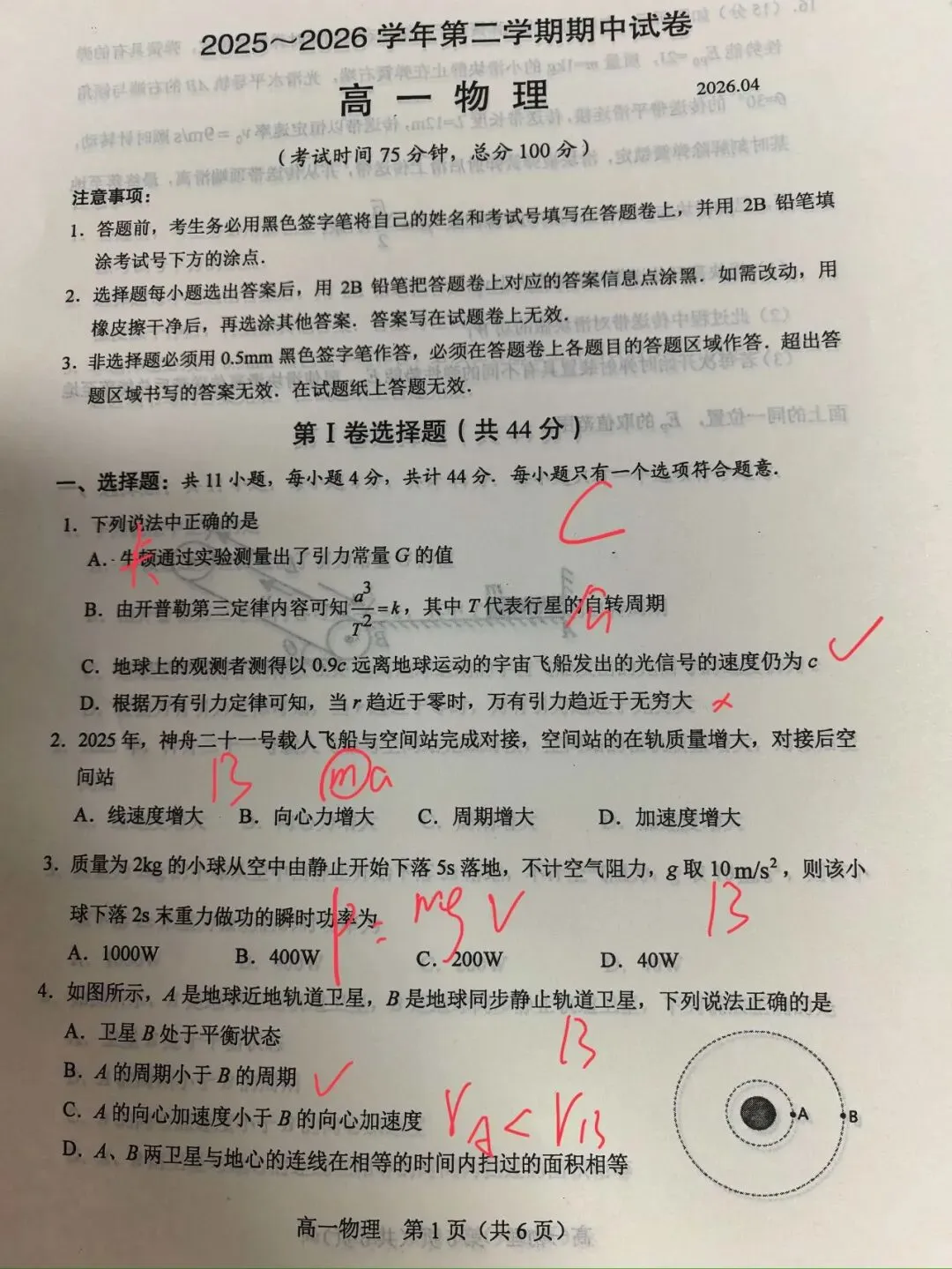 常熟高一物理期中考试试卷及参考答案