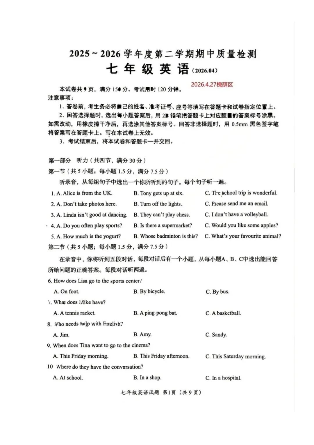 初中试卷|2026上海嘉定 初三二模语文试卷及答案 (word版,免费获取)