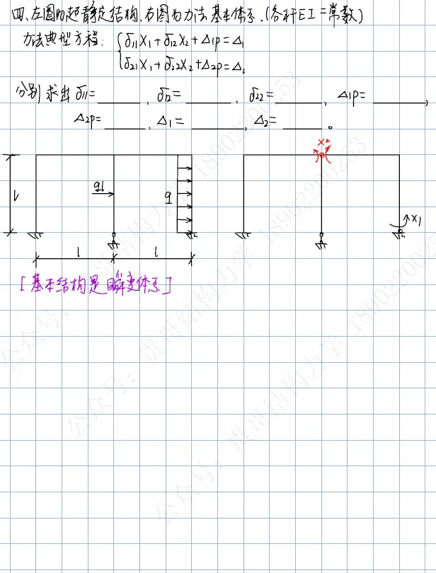 第四题:力法求解两次超静定结构,并求系数和自由项;【但基本结构是瞬变体系】