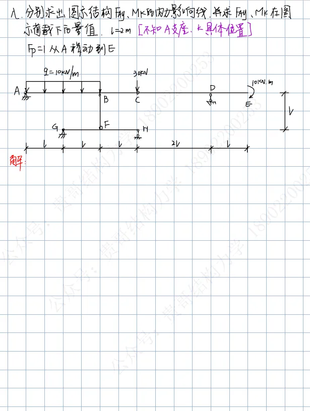 第八题:求结构指定量值的影响线,并求在荷载作用下的量值。【A支座和K截面不明确。】