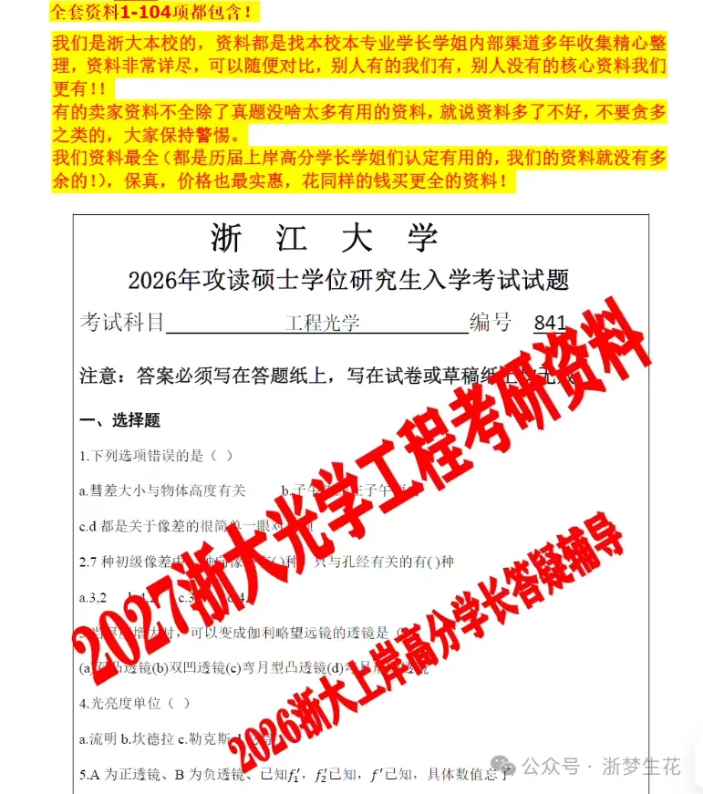 1、浙江大学工程光学841考研真题:2026-1995年