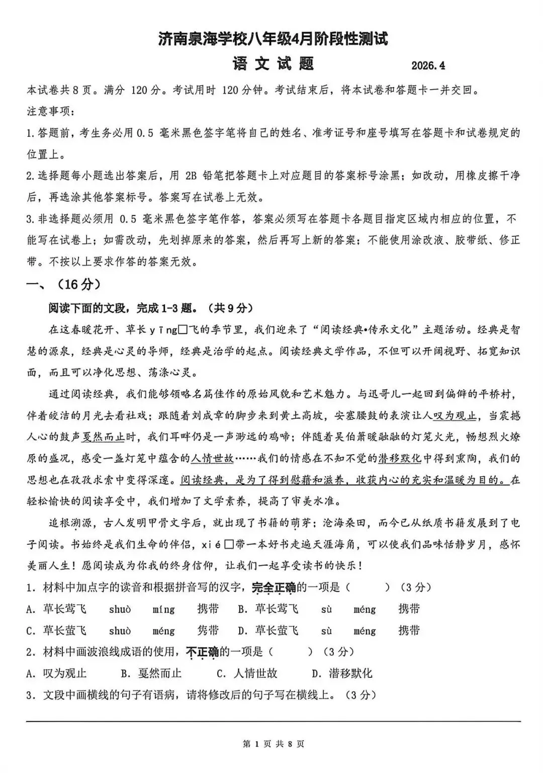 ②:私信公众号,发送“26年七下泉海试卷”免费领取电子打印版