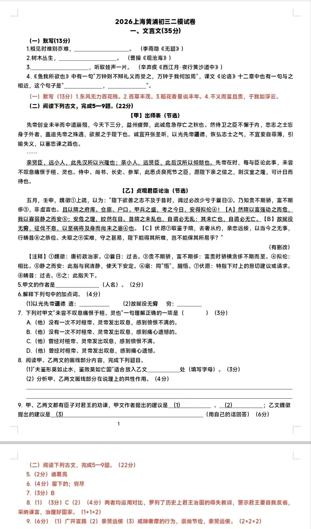 2026上海黄浦初三二模语文试卷(答案)