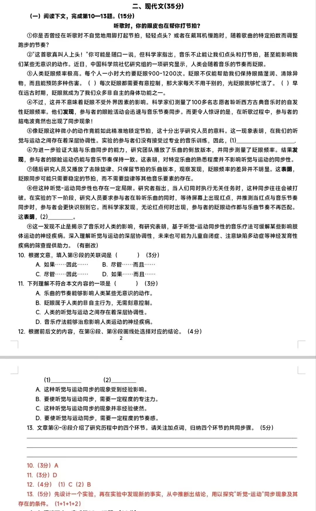 13.(5分)先设计一个实验,再在实验中发现新的事实,从中推断出结论,用以探究“听觉-运动”同步现象及其存在的条件。(1+1+1+2)