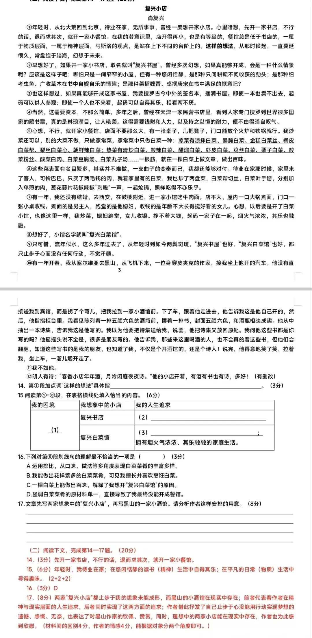 17.(8分)两家“复兴小店”都止步于我的想象未能成形,而黑山的小酒馆在现实中存在;前者代表着作者在精神与现实层面的人生追求,后者同时实现了这两方面的追求;作者借此抒发了自己止步于心没能用行动实现梦想的遗憾、感慨、无奈,也表达了对黑山作家的钦佩、赞赏,同时,理想中的两家小店能在现实中存在,作者也为此感到欣慰。(材料间的区别4分,作者的情感4分,能根据对象分两个角度即可。)