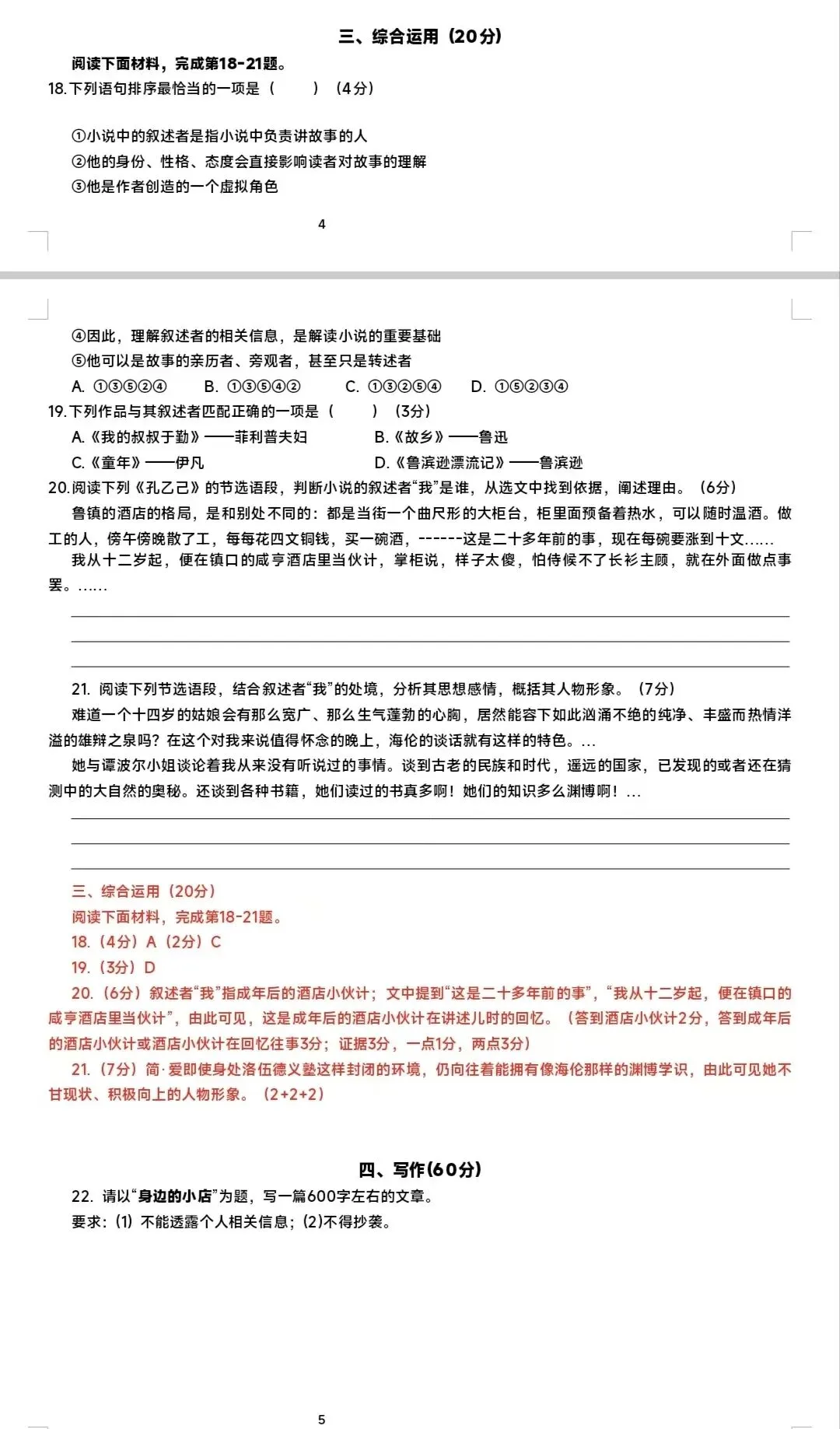 20.(6分)叙述者“我”指成年后的酒店小伙计;文中提到“这是二十多年前的事”,“我从十二岁起,便在镇口的咸亨酒店里当伙计”,由此可见,这是成年后的酒店小伙计在讲述儿时的回忆。(答到酒店小伙计2分,答到成年后的酒店小伙计或酒店小伙计在回忆往事3分;证据3分,一点1分,两点3分)