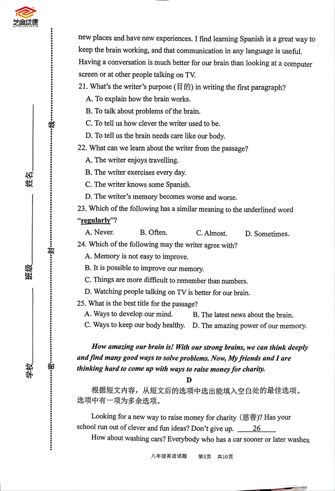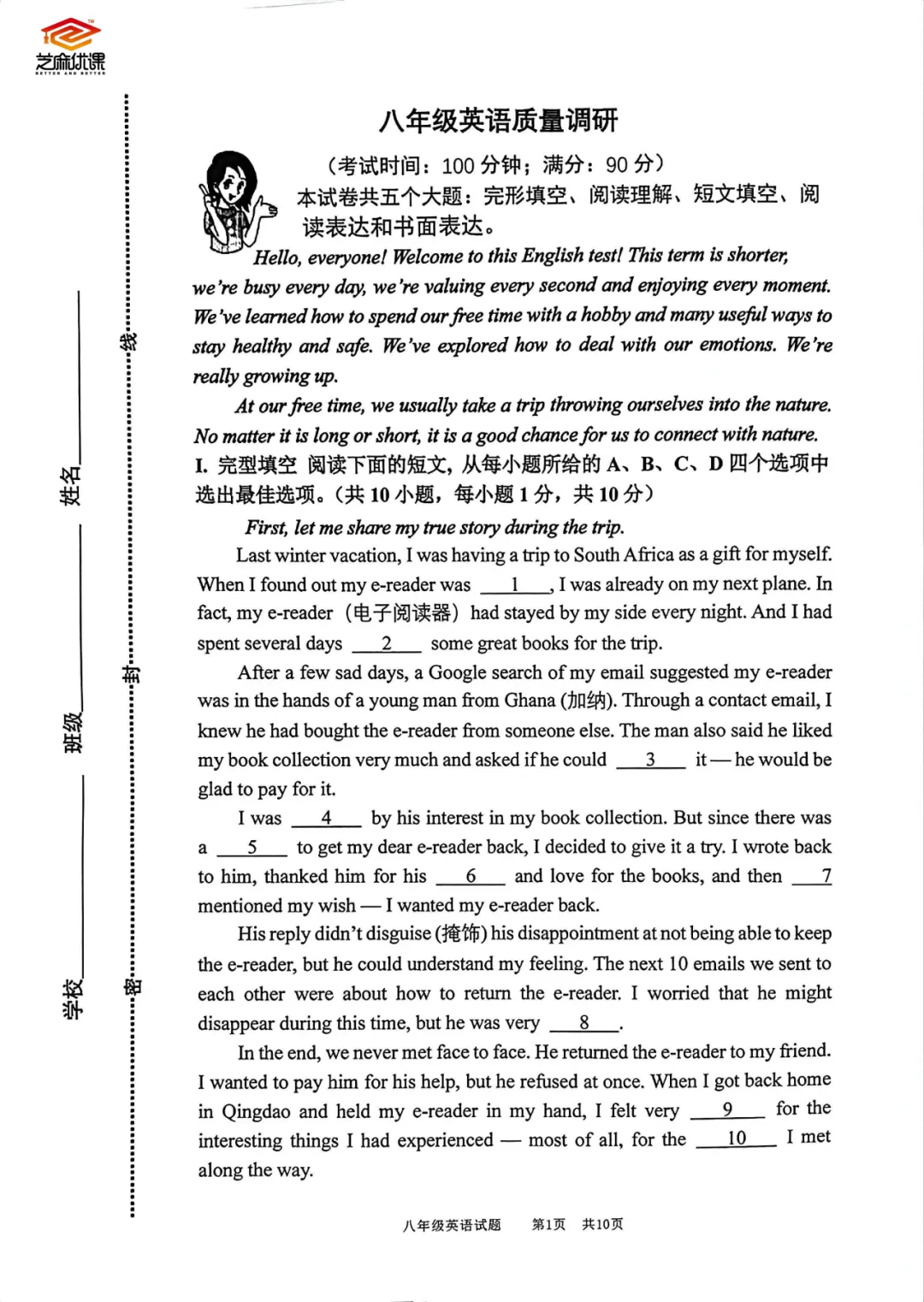 2026年市中区泉海中学七年级语文期中试卷(附答案)