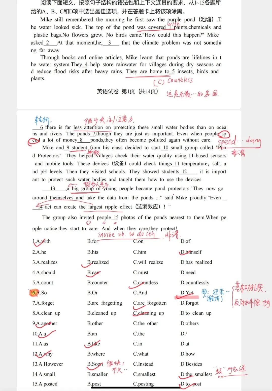 比如第6题,讲保护池塘的。前一句说池塘是无数动植物的家园,后一句突然跟了一个空: