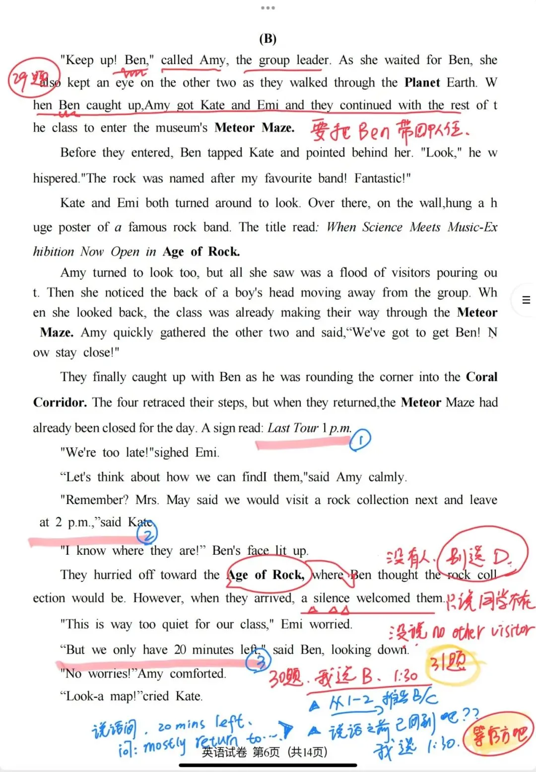 我做这题时,根据前后文的时间线索(标牌写着1点最后一场,随后提到只剩20分钟就要2点集合了),我推断并选了B(1:30 p.m.)。